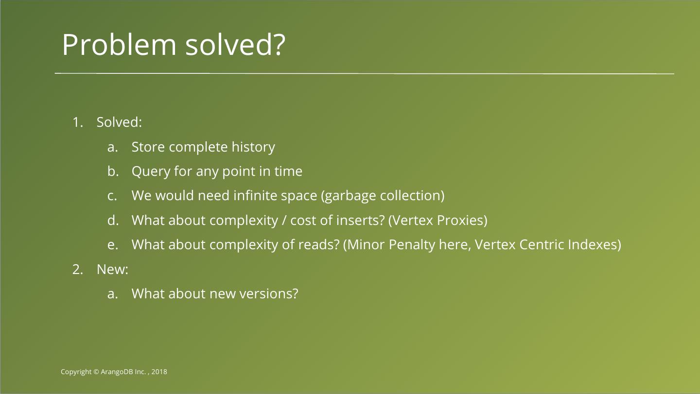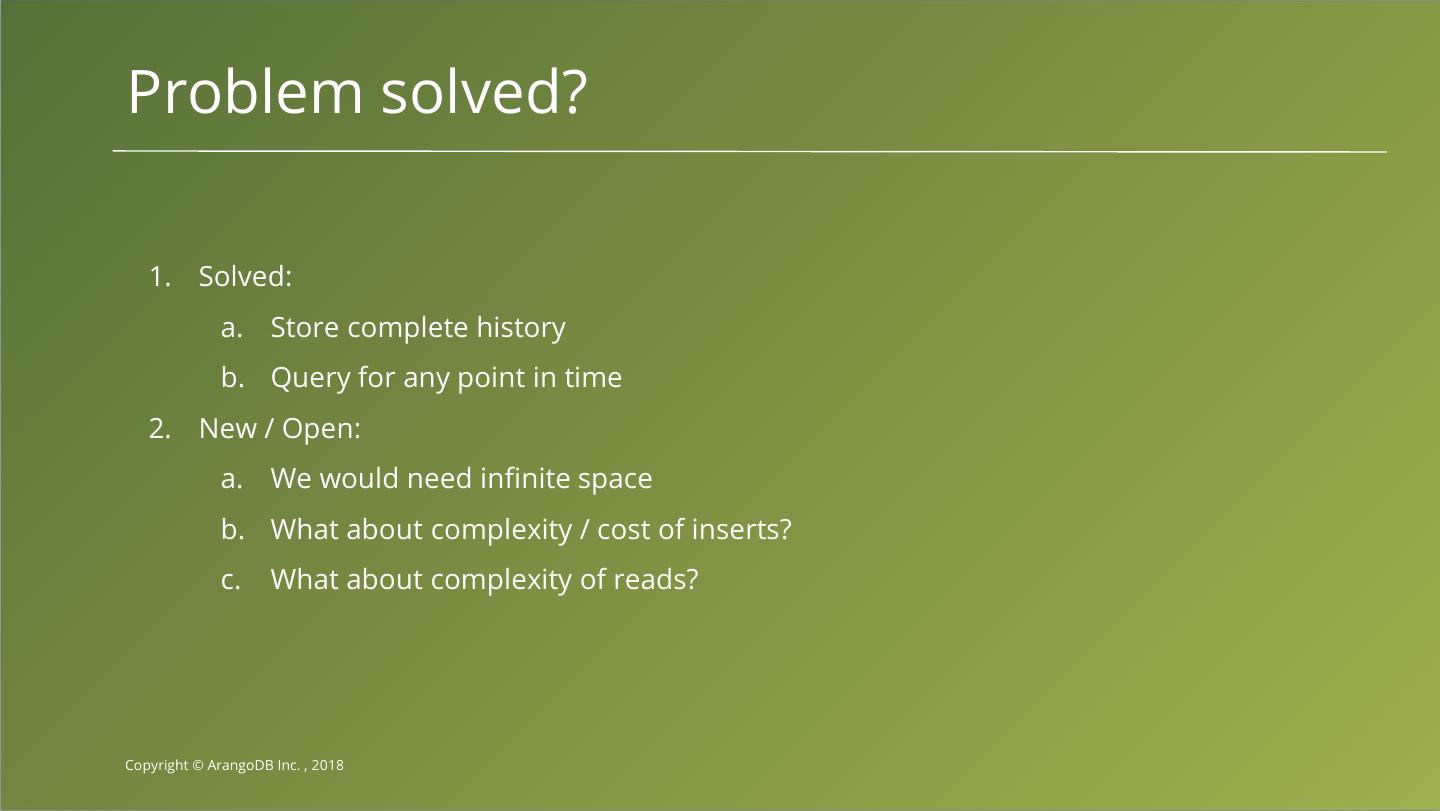 29 .Problem solved? 1. Solved: a. Store complete history b. Query for any point in time 2. New / Open: a. We would need infinite space b. What about complexity / cost of inserts? c. What about complexity of reads? Copyright © ArangoDB Inc. , 2018