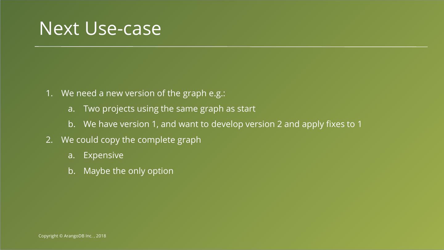 6 .Use-Case 1. We have a graph-data model 2. The data is changing over time 3. We have a requirement that we can see how the data looked like at a certain point in time 4. We are able to compress, archive or delete data older than a certain point. a. If we cannot clean up we need to be prepared for "infinite" production of data. Copyright © ArangoDB Inc. , 2018