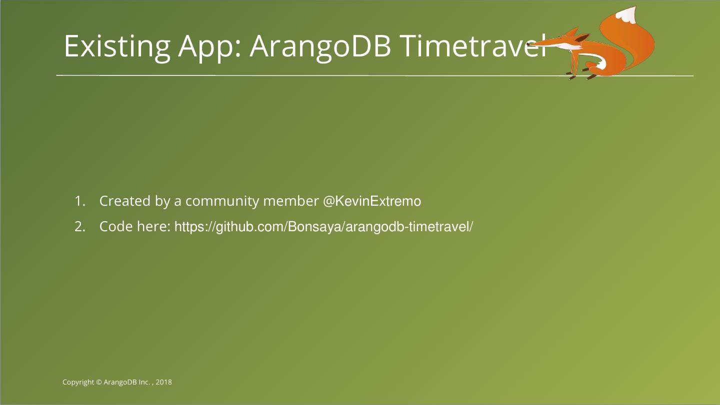 1 . One Engine, one Query Language. Building a Graphy Time Machine Multiple Data Models. Michael Hackstein ArangoDB Inc. Copyright © ArangoDB Inc. , 2018