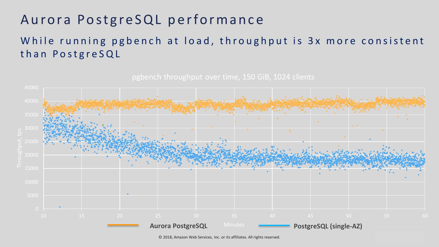 14 . Aurora PostgreSQL performance While running pgbench at load, throughput is 3x more consistent than PostgreSQL pgbench throughput over time, 150 GiB, 1024 clients 45000 40000 35000 30000 Throughput, tps 25000 20000 15000 10000 5000 0 10 15 20 25 30 35 40 45 50 55 60 Aurora PostgreSQL Minutes PostgreSQL (single-AZ) © 2018, Amazon Web Services, Inc. or its affiliates. All rights reserved.