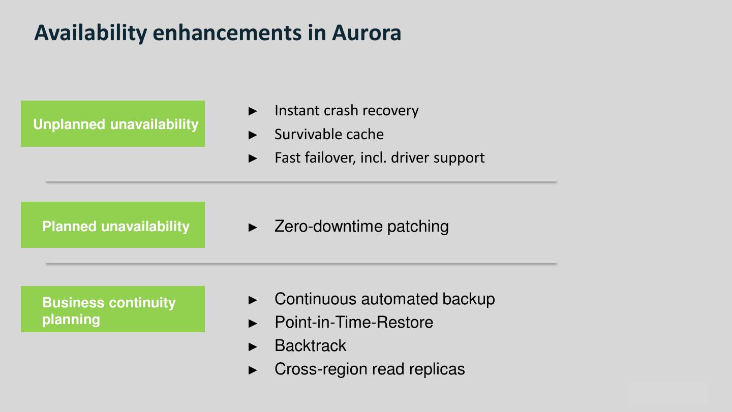 22 .Availability enhancements in Aurora ► Instant crash recovery Unplanned unavailability ► Survivable cache ► Fast failover, incl. driver support Planned unavailability ► Zero-downtime patching Business continuity ► Continuous automated backup planning ► Point-in-Time-Restore ► Backtrack ► Cross-region read replicas