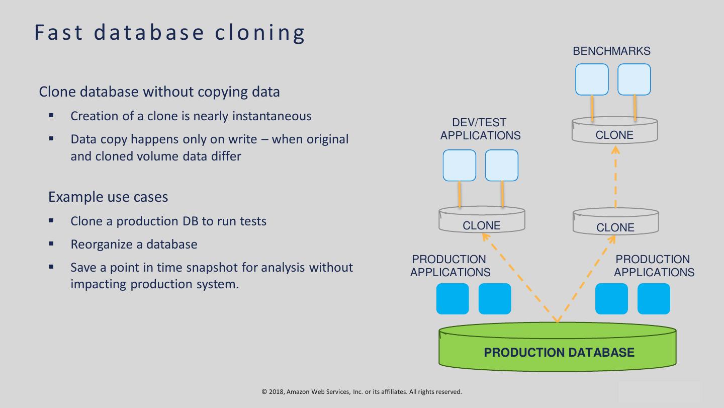 27 .Fast d atabase clo n ing BENCHMARKS Clone database without copying data ▪ Creation of a clone is nearly instantaneous DEV/TEST ▪ Data copy happens only on write – when original APPLICATIONS CLONE and cloned volume data differ Example use cases ▪ Clone a production DB to run tests CLONE CLONE ▪ Reorganize a database PRODUCTION PRODUCTION ▪ Save a point in time snapshot for analysis without APPLICATIONS APPLICATIONS impacting production system. PRODUCTION DATABASE © 2018, Amazon Web Services, Inc. or its affiliates. All rights reserved.