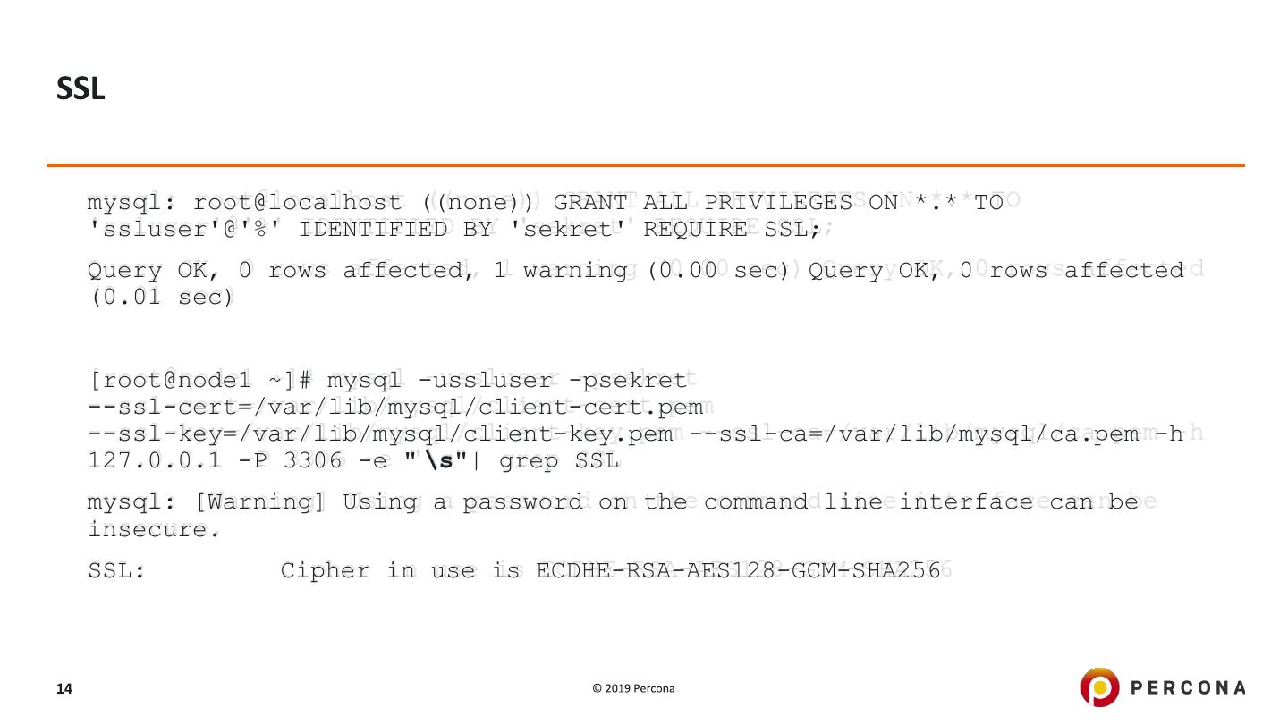 14 .mysql: root@localhost ((none)) GRANT ALL PRIVILEGES ON *.* TO 'ssluser'@'%' IDENTIFIED BY 'sekret' REQUIRE SSL; Query OK, 0 rows affected, 1 warning (0.00 sec) Query OK, 0 rows affected (0.01 sec) [root@node1 ~]# mysql -ussluser -psekret --ssl-cert=/var/lib/mysql/client-cert.pem --ssl-key=/var/lib/mysql/client-key.pem --ssl-ca=/var/lib/mysql/ca.pem -h 127.0.0.1 -P 3306 -e " \s"| grep SSL mysql: [Warning] Using a password on the command line interface can be insecure. SSL: Cipher in use is ECDHE-RSA-AES128-GCM-SHA256