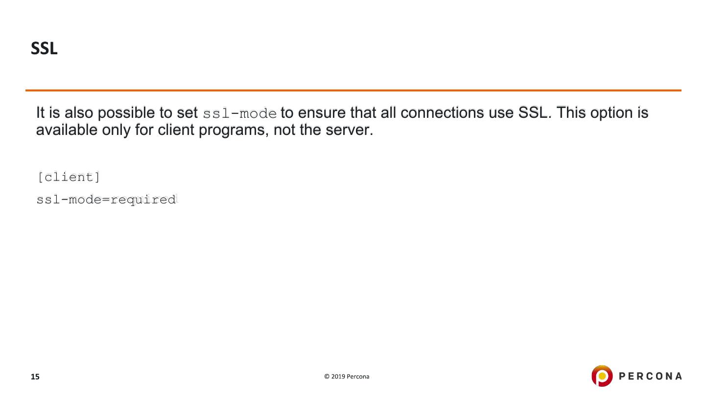 15 .It is also possible to set ssl-mode to ensure that all connections use SSL. This option is available only for client programs, not the server. [client] ssl-mode=required