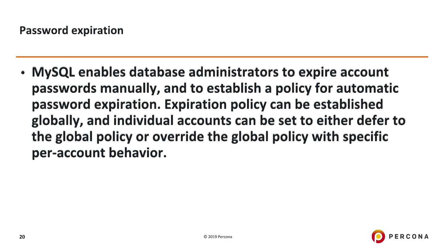 21 .mysql> create user test_expired_user@localhost identified by 'Sekr$K1et' PASSWORD EXPIRE INTERVAL 1 day; Query OK, 0 rows affected (0.01 sec) mysql> SET GLOBAL default_password_lifetime = 1;