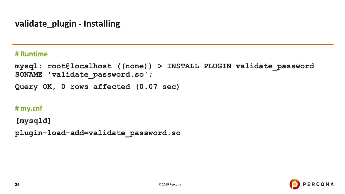 24 .mysql: root@localhost ((none)) > INSTALL PLUGIN validate_password SONAME 'validate_password.so'; Query OK, 0 rows affected (0.07 sec) [mysqld] plugin-load-add=validate_password.so