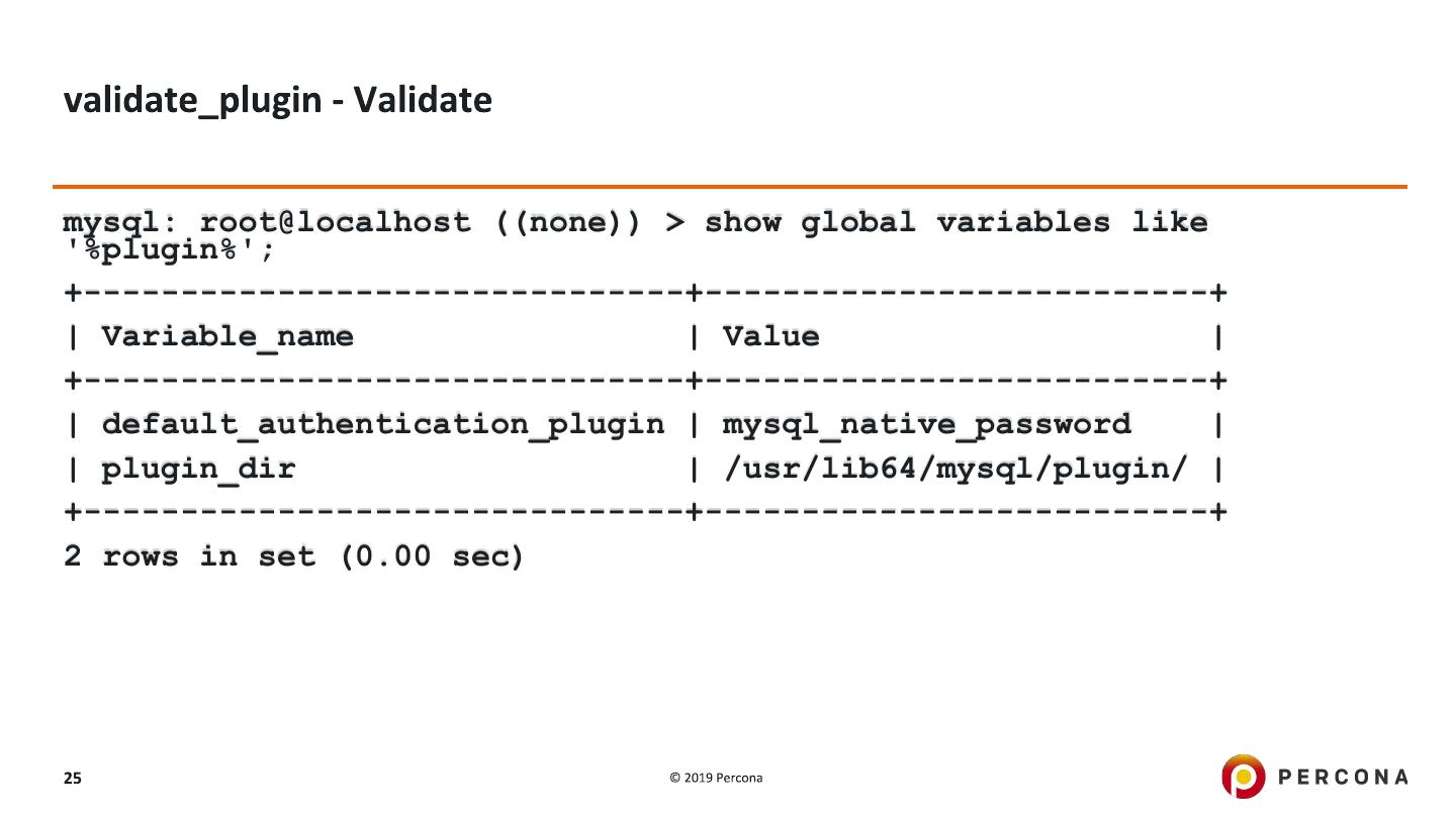 25 .mysql: root@localhost ((none)) > show global variables like '%plugin%'; +-------------------------------+--------------------------+ | Variable_name | Value | +-------------------------------+--------------------------+ | default_authentication_plugin | mysql_native_password | | plugin_dir | /usr/lib64/mysql/plugin/ | +-------------------------------+--------------------------+ 2 rows in set (0.00 sec)