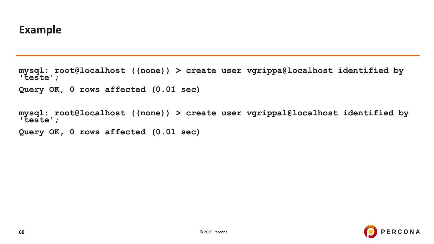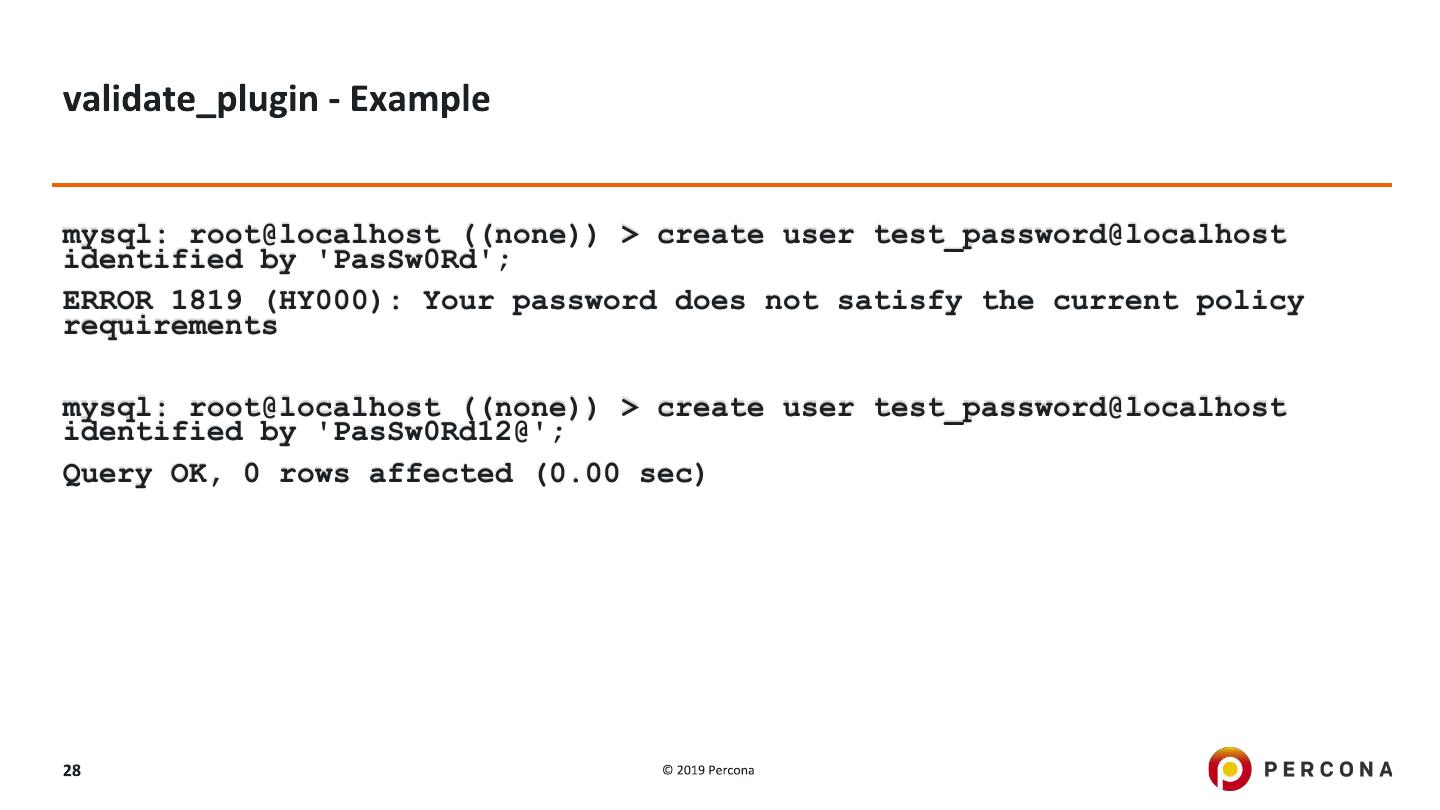 28 .mysql: root@localhost ((none)) > create user test_password@localhost identified by 'PasSw0Rd'; ERROR 1819 (HY000): Your password does not satisfy the current policy requirements mysql: root@localhost ((none)) > create user test_password@localhost identified by 'PasSw0Rd12@'; Query OK, 0 rows affected (0.00 sec)