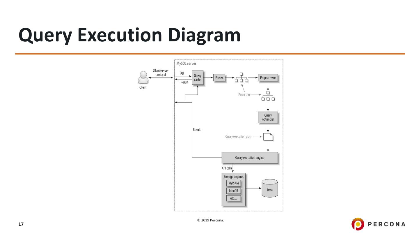 16 .Execution Basics Single Server Single Thread (Using Single CPU Core) No Intermediate Results Caching Between Query Executions © 2019 Percona. 16