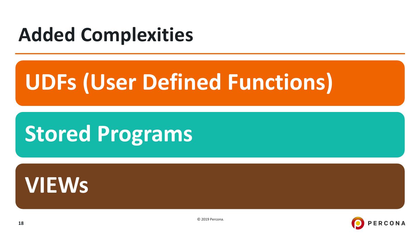 18 .Added Complexities UDFs (User Defined Functions) Stored Programs VIEWs © 2019 Percona. 18