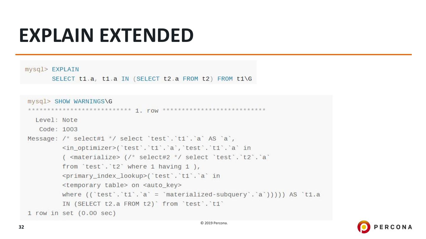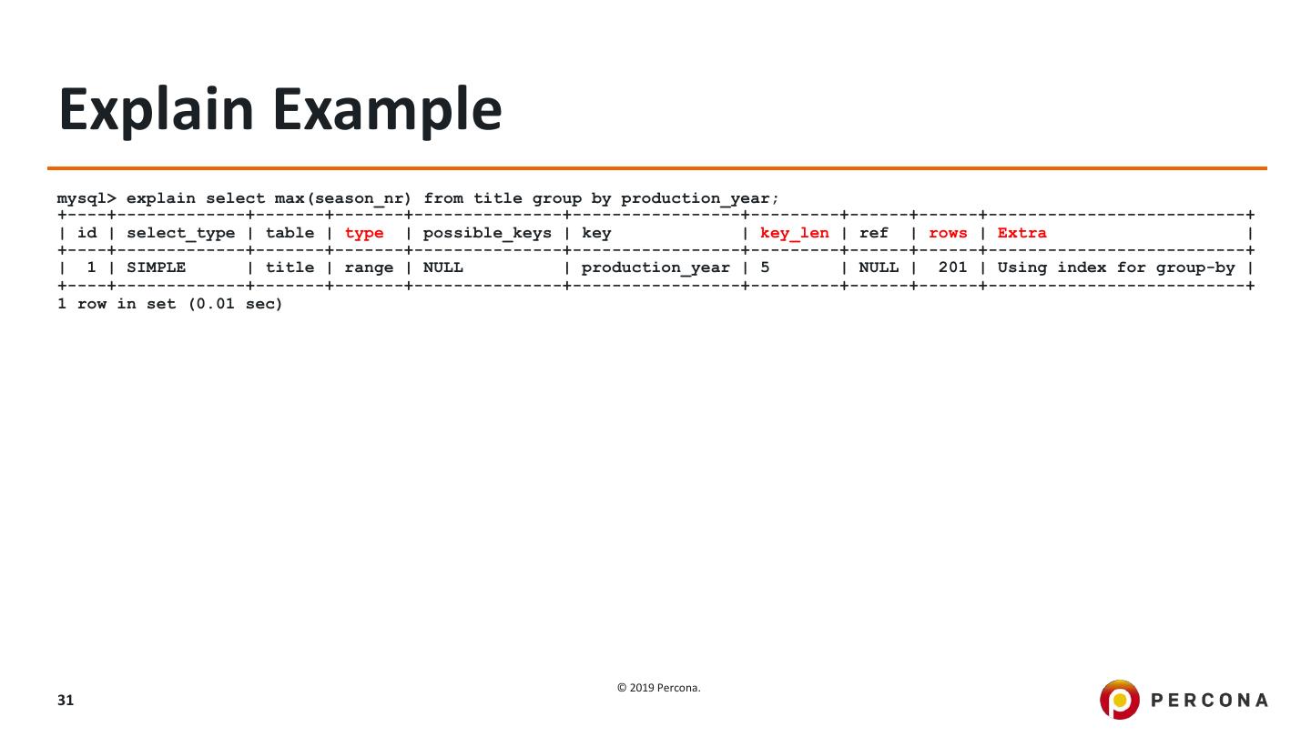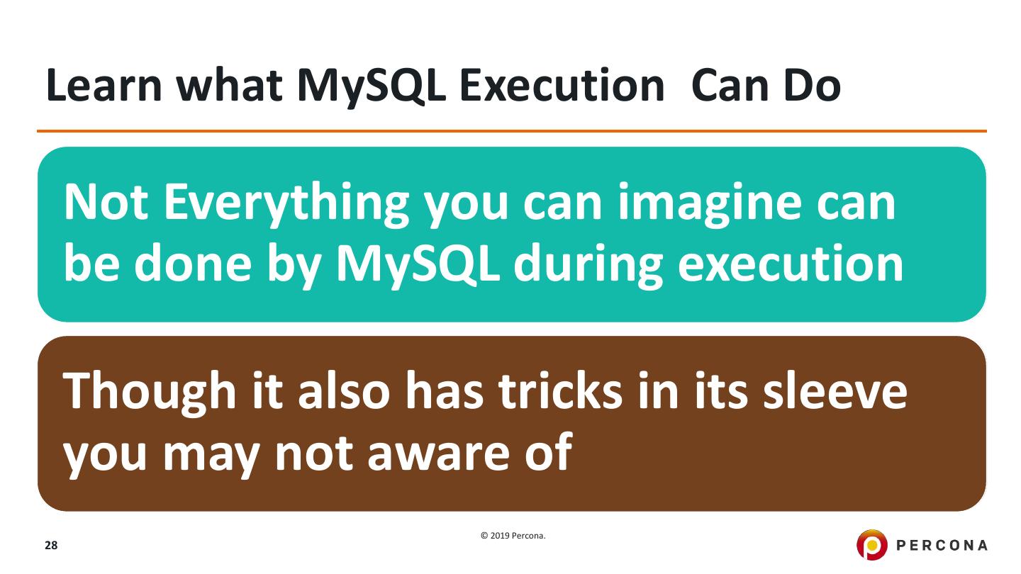 28 .Learn what MySQL Execution Can Do Not Everything you can imagine can be done by MySQL during execution Though it also has tricks in its sleeve you may not aware of © 2019 Percona. 28