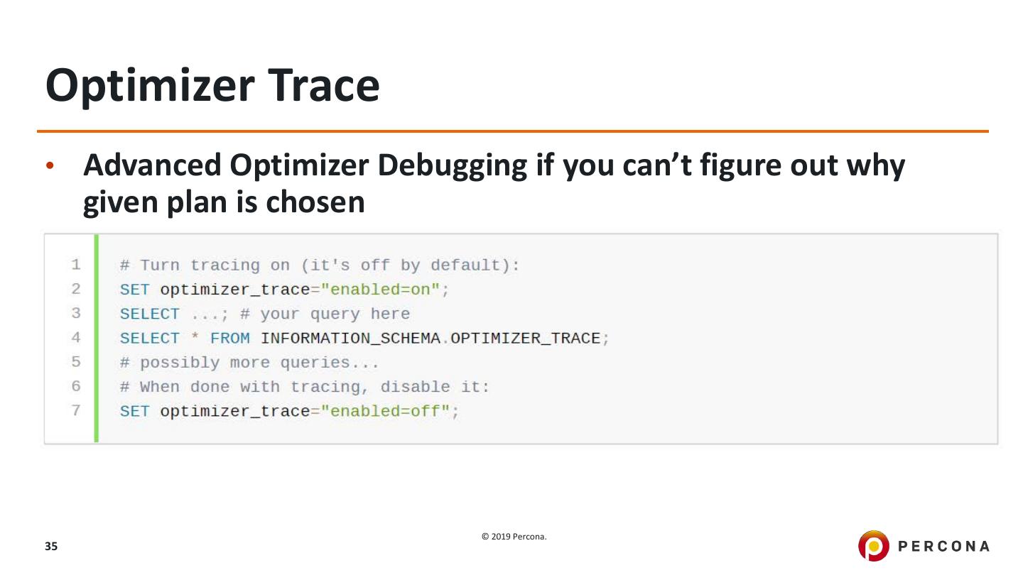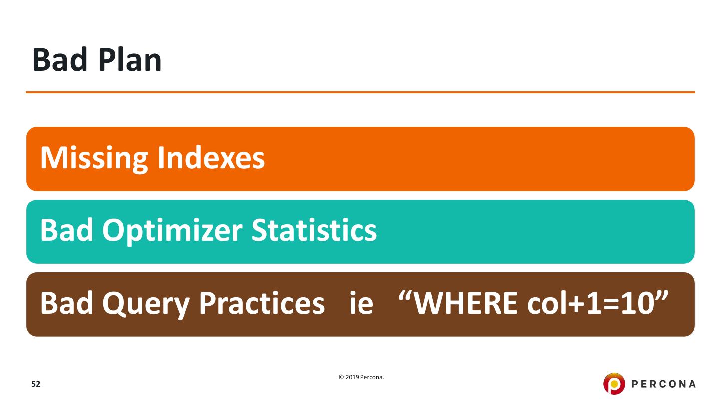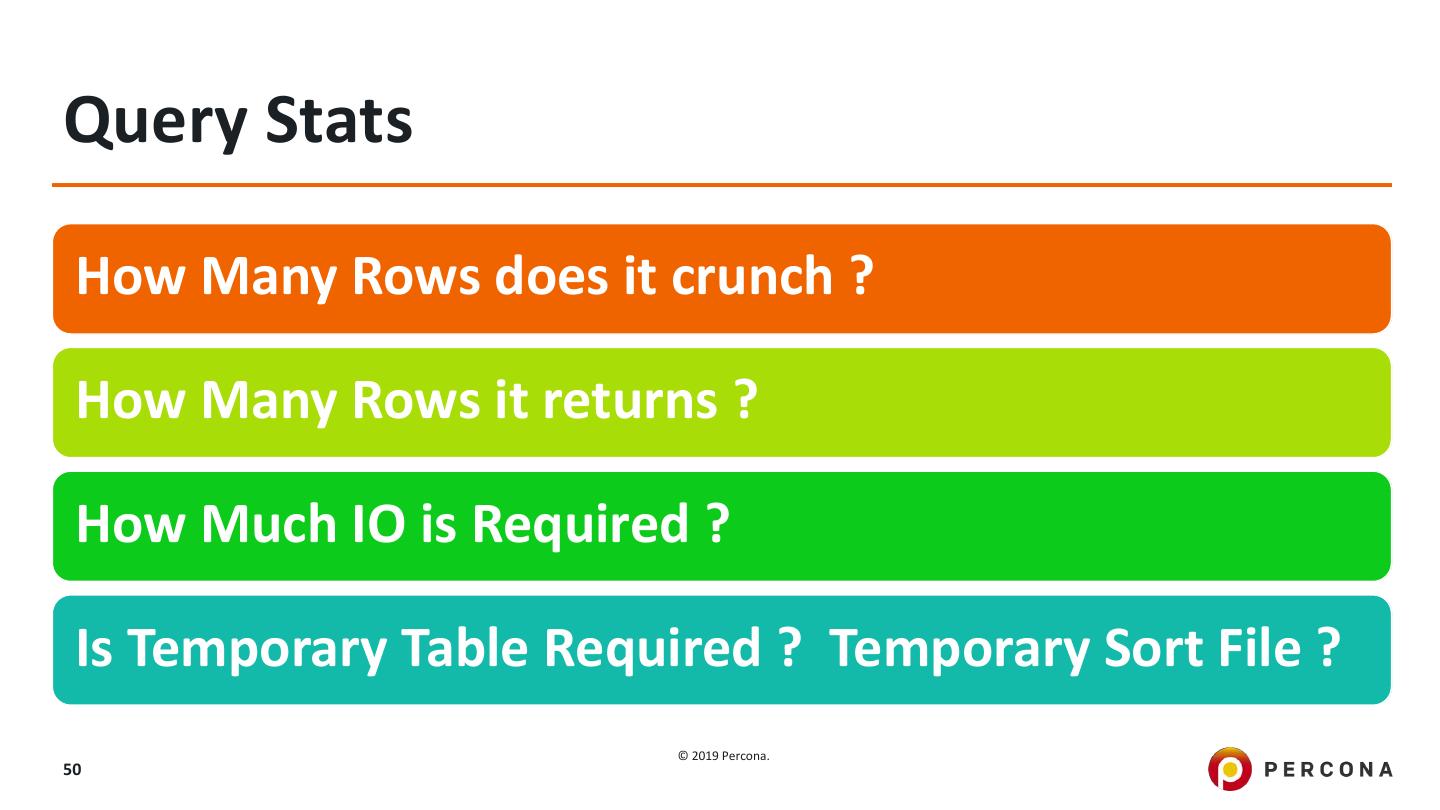 28 .Learn what MySQL Execution Can Do Not Everything you can imagine can be done by MySQL during execution Though it also has tricks in its sleeve you may not aware of © 2019 Percona. 28