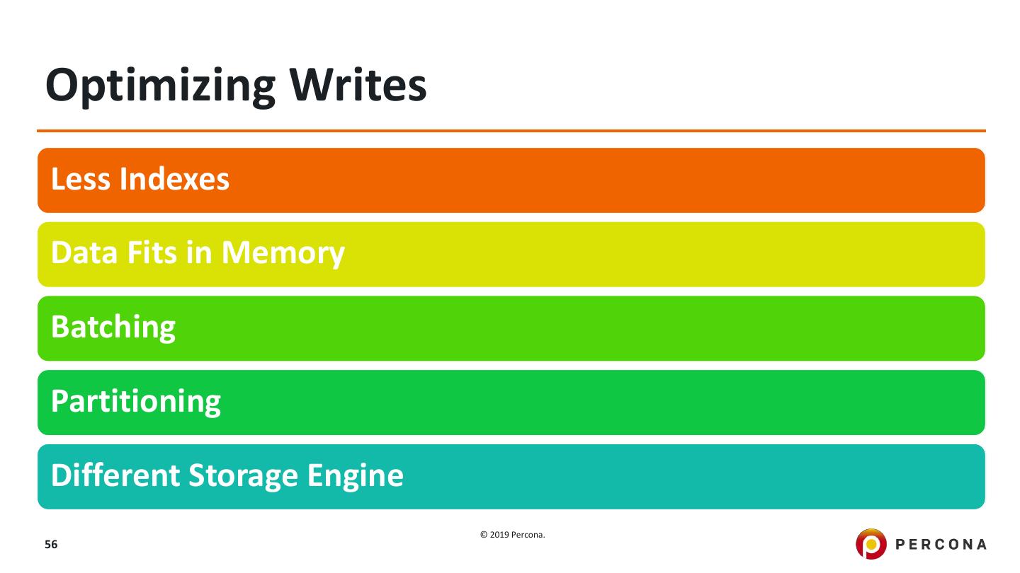21 .Indexes Proper Indexes are must have for Optimal Query Execution Can improve Query Performance 1000x or more Expensive to Maintain… so Do not Overdo Covering Indexes to speed up data reads © 2019 Percona. 21