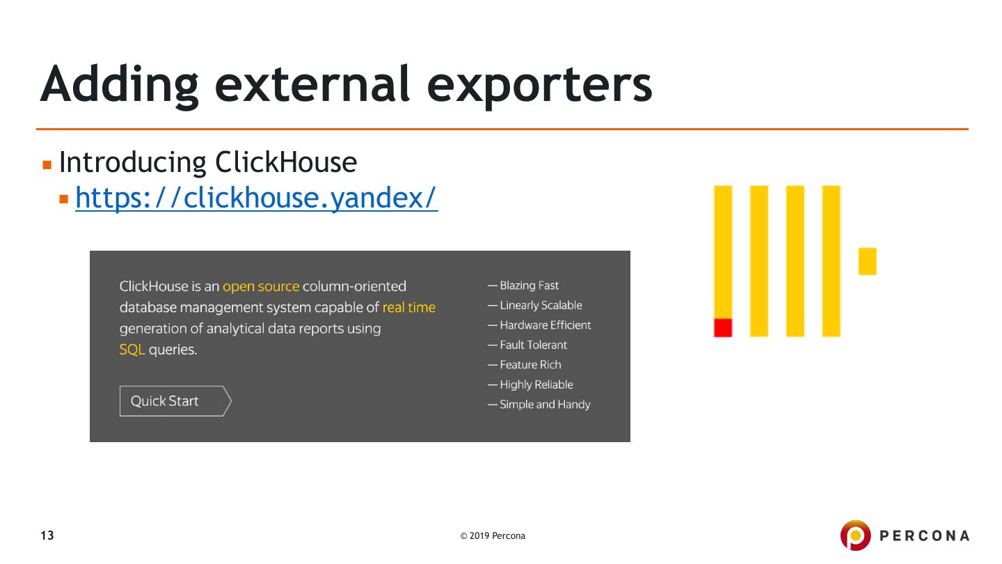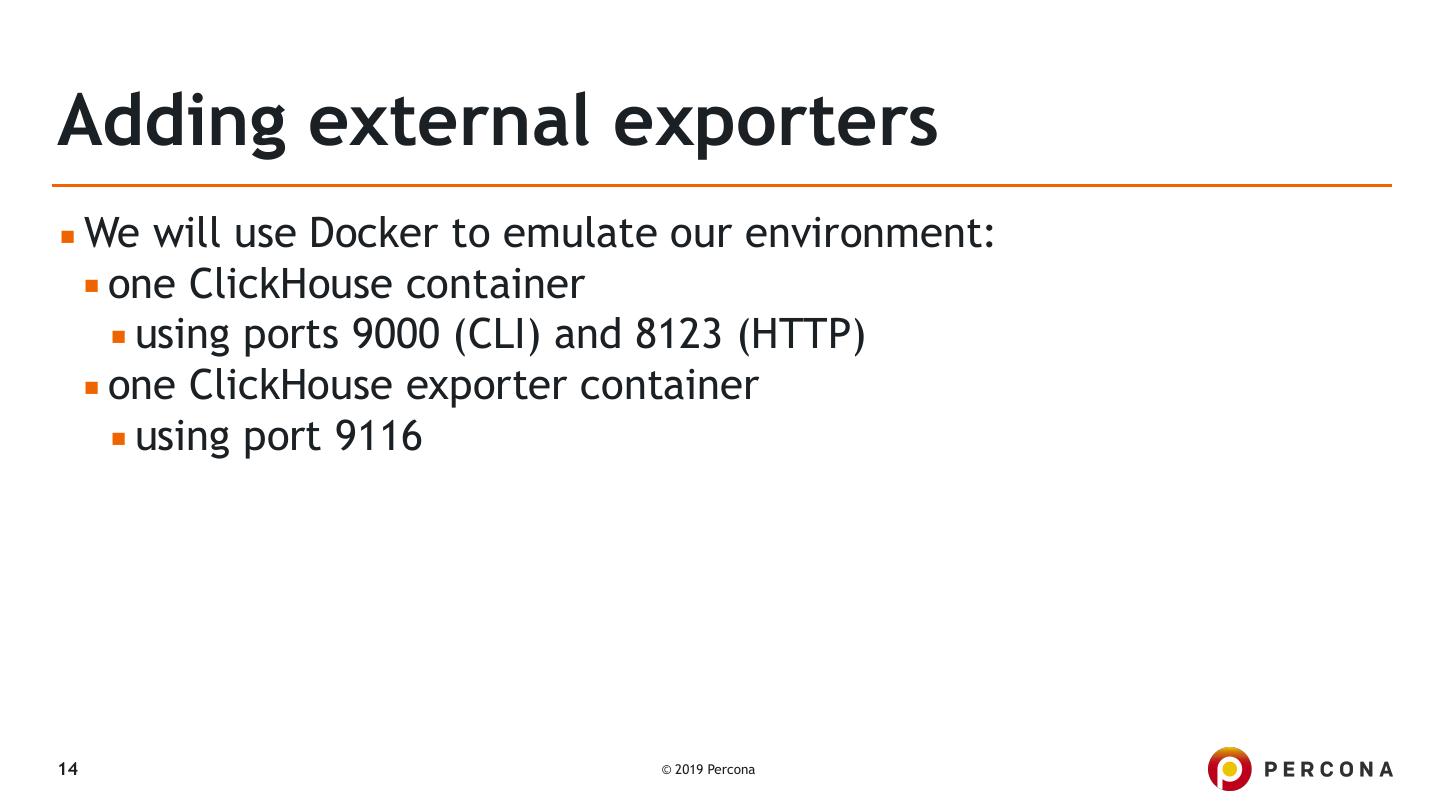 13 .Adding external exporters ▪ Introducing ClickHouse ▪ https://clickhouse.yandex/ 13 © 2019 Percona