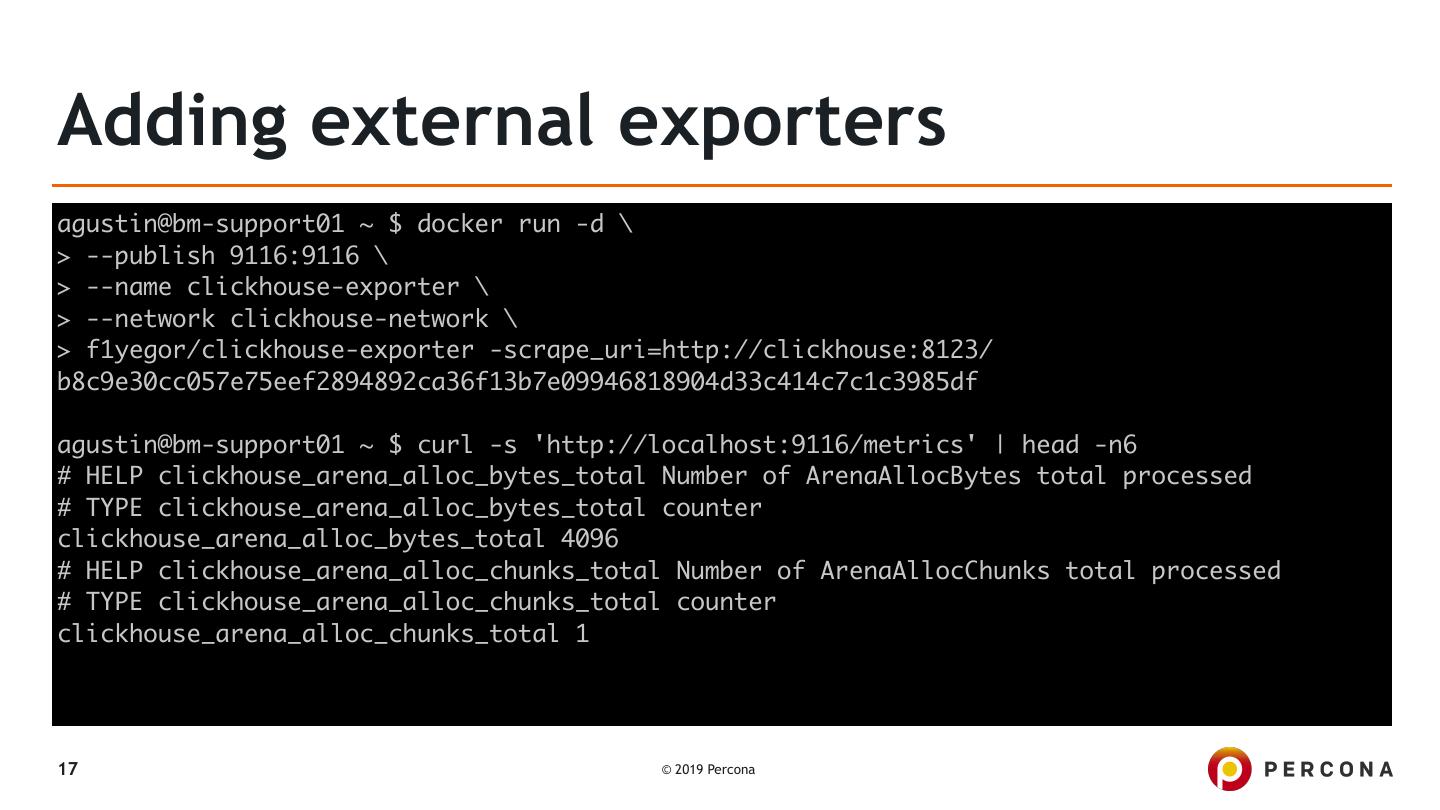 16 .Adding external exporters agustin@bm-support01 ~ $ docker run -it --rm --network host yandex/clickhouse-client --host localhost ClickHouse client version 19.5.2.6 (official build). Connecting to localhost:9000 as user default. Connected to ClickHouse server version 1.1.54380 revision 54380. 0c5bc6e217eb :) show databases; SHOW DATABASES !"name""""# $ default $ $ system $ %"""""""""& 2 rows in set. Elapsed: 0.014 sec. 16 © 2019 Percona