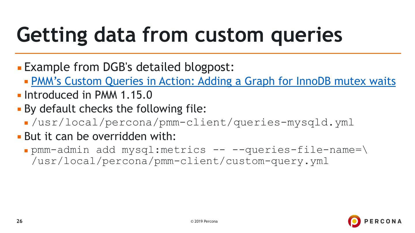 25 .Getting data from custom queries ▪ Example from DGB's detailed blogpost: ▪ PMM’s Custom Queries in Action: Adding a Graph for InnoDB mutex waits 25 © 2019 Percona