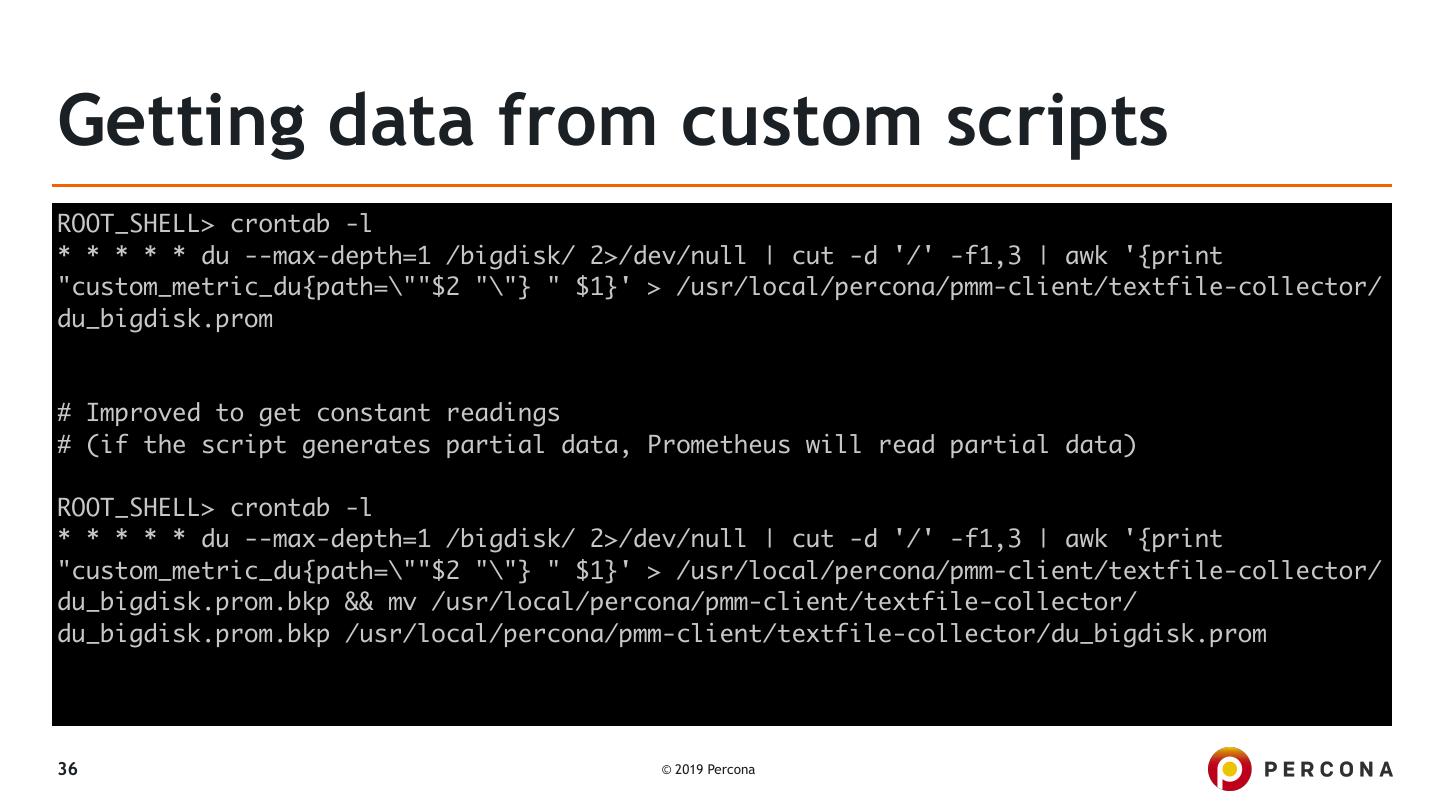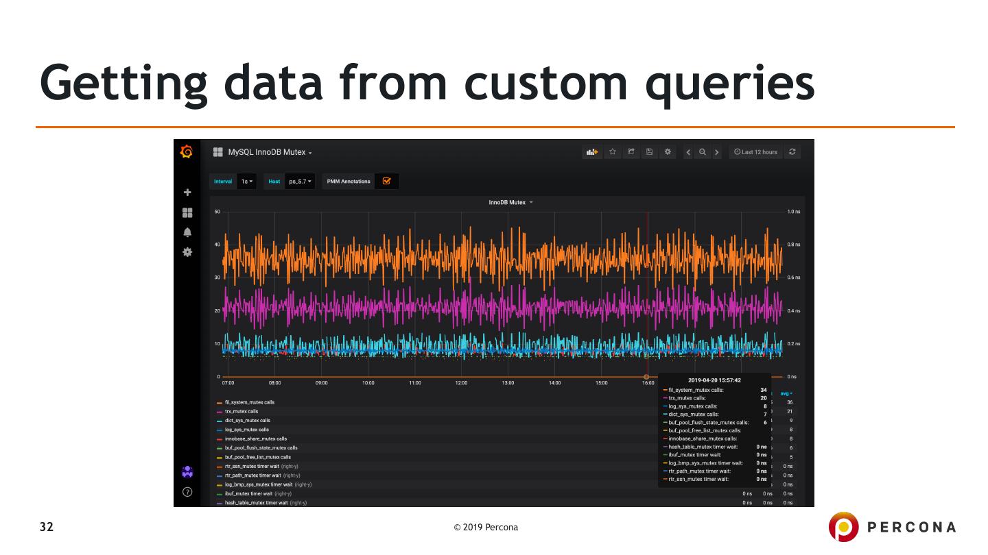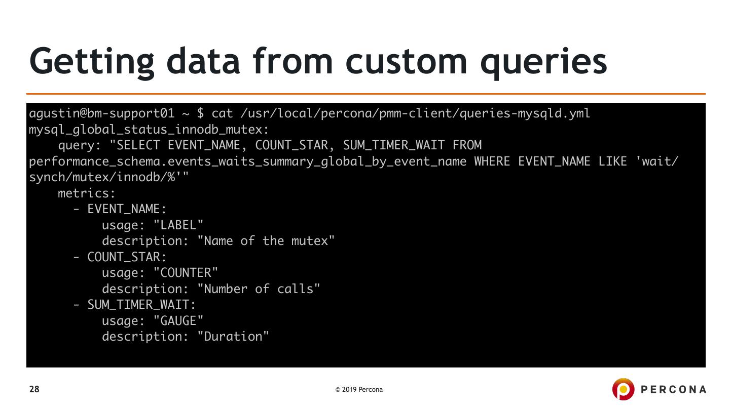 28 .Getting data from custom queries agustin@bm-support01 ~ $ cat /usr/local/percona/pmm-client/queries-mysqld.yml mysql_global_status_innodb_mutex: query: "SELECT EVENT_NAME, COUNT_STAR, SUM_TIMER_WAIT FROM performance_schema.events_waits_summary_global_by_event_name WHERE EVENT_NAME LIKE 'wait/ synch/mutex/innodb/%'" metrics: - EVENT_NAME: usage: "LABEL" description: "Name of the mutex" - COUNT_STAR: usage: "COUNTER" description: "Number of calls" - SUM_TIMER_WAIT: usage: "GAUGE" description: "Duration" 28 © 2019 Percona
