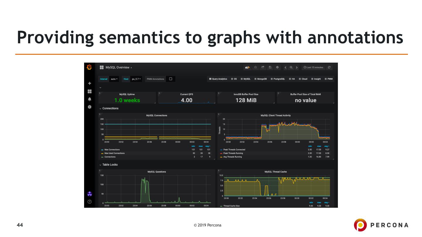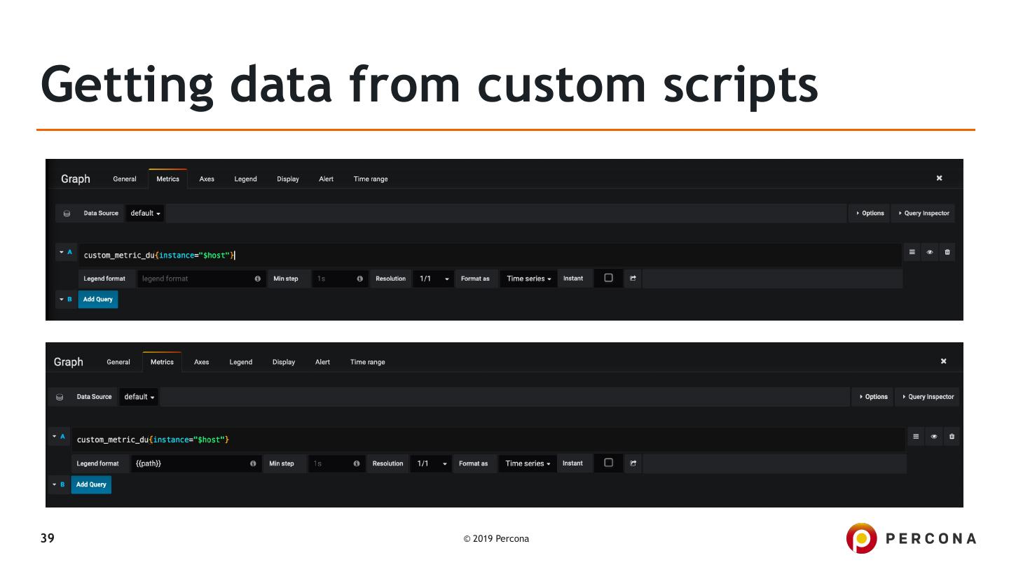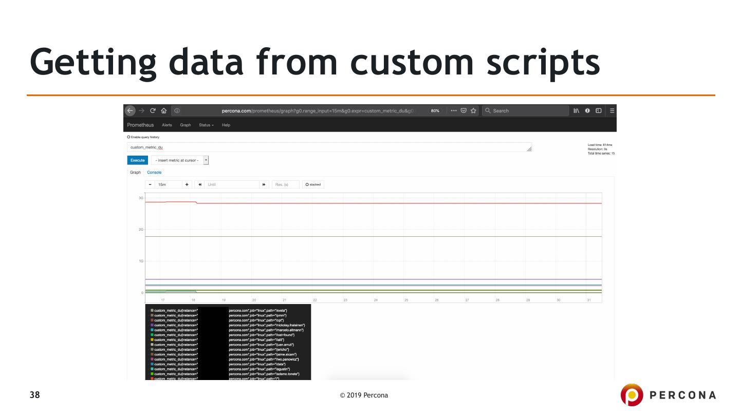 26 .Getting data from custom queries ▪ Example from DGB's detailed blogpost: ▪ PMM’s Custom Queries in Action: Adding a Graph for InnoDB mutex waits ▪ Introduced in PMM 1.15.0 ▪ By default checks the following file: ▪ /usr/local/percona/pmm-client/queries-mysqld.yml ▪ But it can be overridden with: ▪ pmm-admin add mysql:metrics -- --queries-file-name=\ /usr/local/percona/pmm-client/custom-query.yml 26 © 2019 Percona