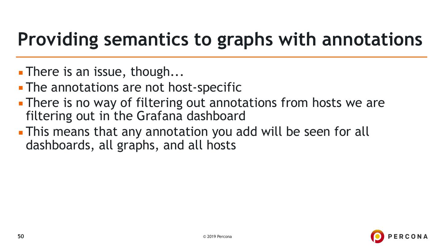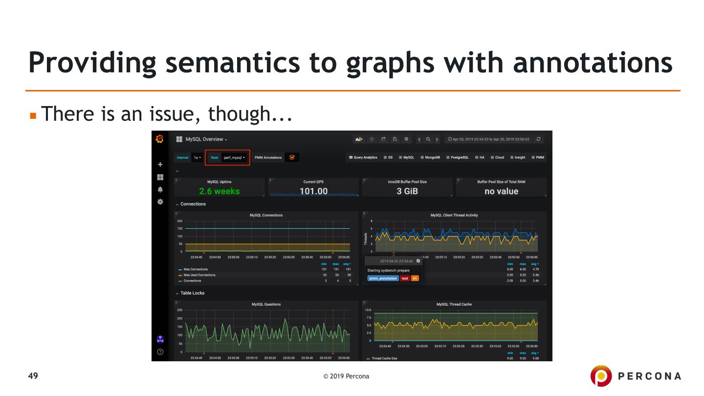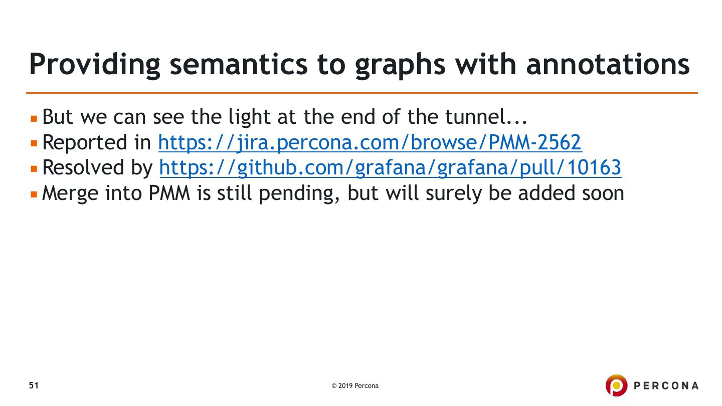 26 .Getting data from custom queries ▪ Example from DGB's detailed blogpost: ▪ PMM’s Custom Queries in Action: Adding a Graph for InnoDB mutex waits ▪ Introduced in PMM 1.15.0 ▪ By default checks the following file: ▪ /usr/local/percona/pmm-client/queries-mysqld.yml ▪ But it can be overridden with: ▪ pmm-admin add mysql:metrics -- --queries-file-name=\ /usr/local/percona/pmm-client/custom-query.yml 26 © 2019 Percona