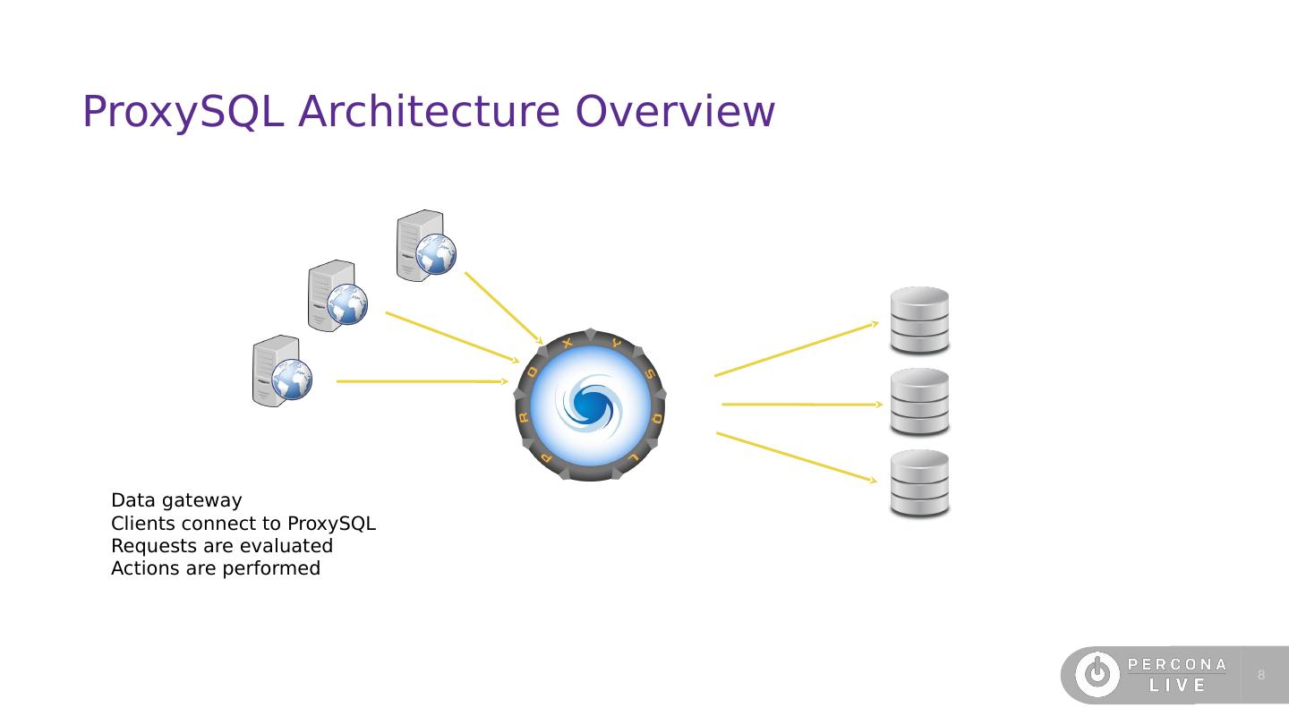 8 .ProxySQL Architecture Overview Data gateway Clients connect to ProxySQL Requests are evaluated Actions are performed 8