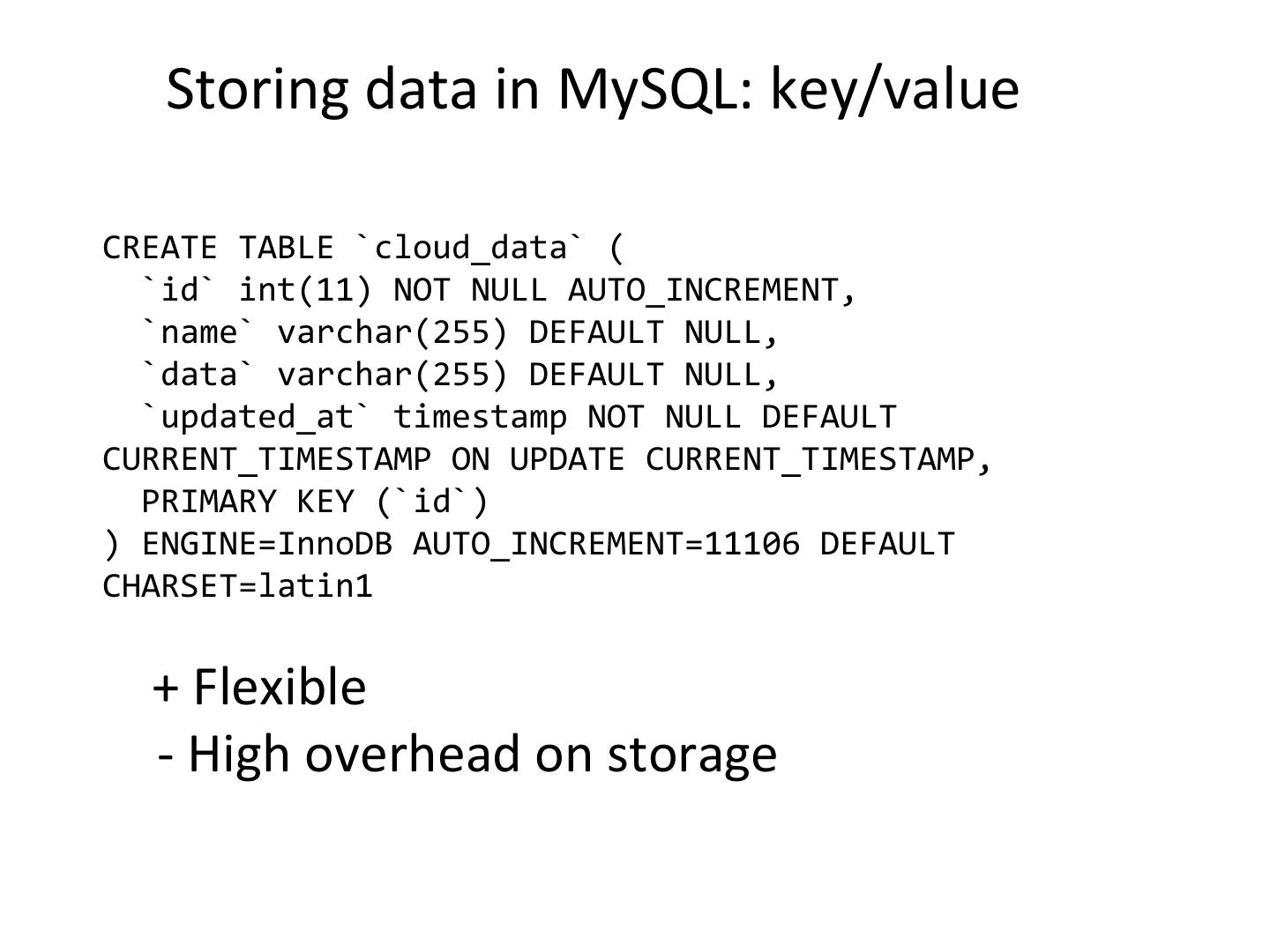 14 . Storing data in MySQL: key/value CREATE TABLE `cloud_data` ( `id` int(11) NOT NULL AUTO_INCREMENT, `name` varchar(255) DEFAULT NULL, `data` varchar(255) DEFAULT NULL, `updated_at` timestamp NOT NULL DEFAULT CURRENT_TIMESTAMP ON UPDATE CURRENT_TIMESTAMP, PRIMARY KEY (`id`) ) ENGINE=InnoDB AUTO_INCREMENT=11106 DEFAULT CHARSET=latin1 + Flexible - High overhead on storage