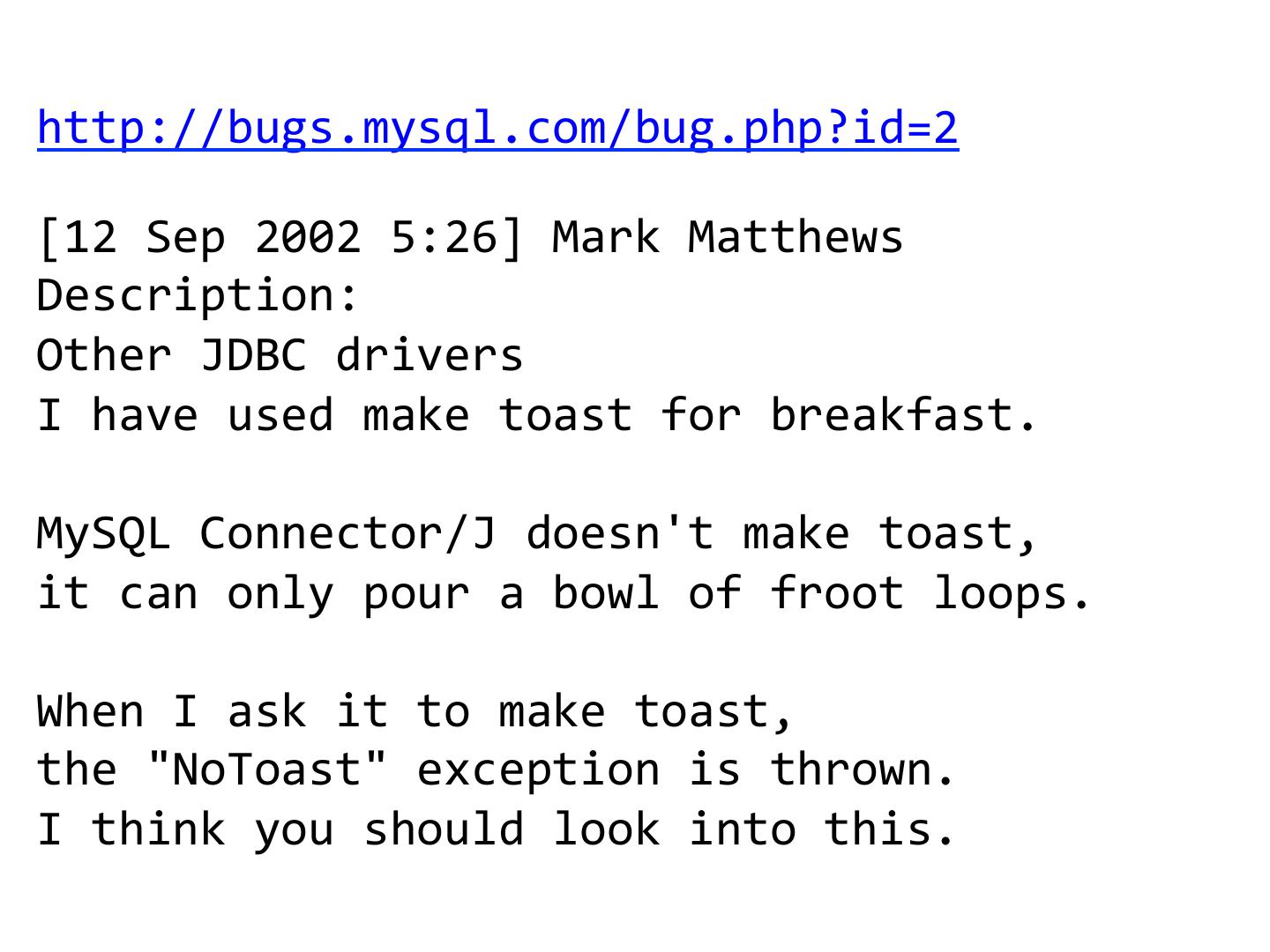 18 .http://bugs.mysql.com/bug.php?id=2 [12 Sep 2002 5:26] Mark Matthews Description: Other JDBC drivers I have used make toast for breakfast. MySQL Connector/J doesn't make toast, it can only pour a bowl of froot loops. When I ask it to make toast, the "NoToast" exception is thrown. I think you should look into this.