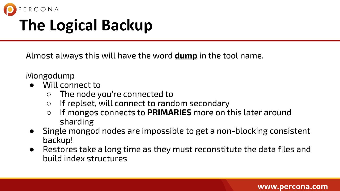 5 .The Logical Backup Almost always this will have the word dump in the tool name. Mongodump ● Will connect to ○ The node you're connected to ○ If replset, will connect to random secondary ○ If mongos connects to PRIMARIES more on this later around sharding ● Single mongod nodes are impossible to get a non-blocking consistent backup! ● Restores take a long time as they must reconstitute the data files and build index structures www.percona.com