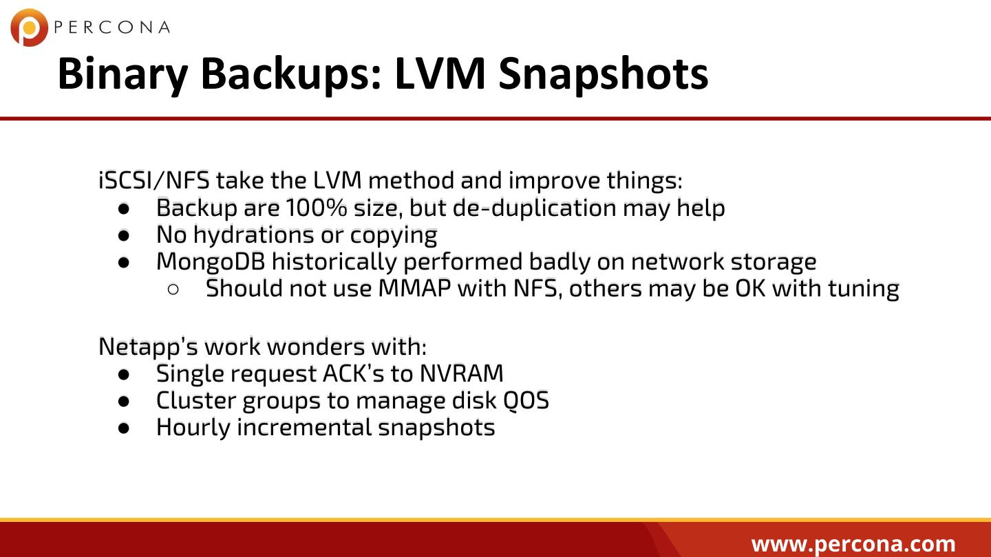 7 .Binary Backups: iSCSI/NFS Snapshots LVM comes with some considerations: ● Backup will be 100% the size of the real data ● No need to re-hydrate Snapshot can be made instantly but have some requirements: ● Space must exist on the Volume Group ● COW will reduce performance while active Restores are fast and consistent for a replSet or single node www.percona.com