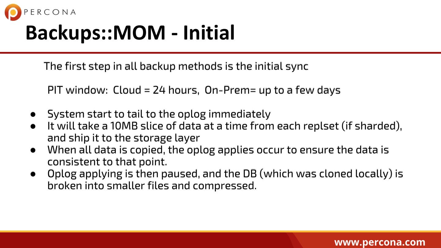 11 .Backups::MOM - Initial The first step in all backup methods is the initial sync PIT window: Cloud = 24 hours, On-Prem= up to a few days ● System start to tail to the oplog immediately ● It will take a 10MB slice of data at a time from each replset (if sharded), and ship it to the storage layer ● When all data is copied, the oplog applies occur to ensure the data is consistent to that point. ● Oplog applying is then paused, and the DB (which was cloned locally) is broken into smaller files and compressed. www.percona.com