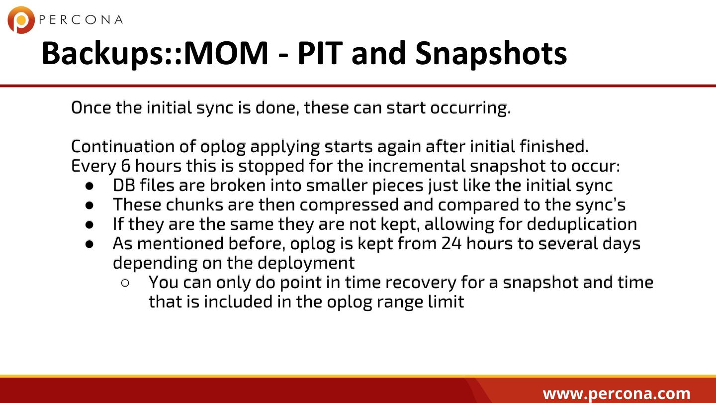 12 .Backups::MOM - PIT and Snapshots Once the initial sync is done, these can start occurring. Continuation of oplog applying starts again after initial finished. Every 6 hours this is stopped for the incremental snapshot to occur: ● DB files are broken into smaller pieces just like the initial sync ● These chunks are then compressed and compared to the sync’s ● If they are the same they are not kept, allowing for deduplication ● As mentioned before, oplog is kept from 24 hours to several days depending on the deployment ○ You can only do point in time recovery for a snapshot and time that is included in the oplog range limit www.percona.com
