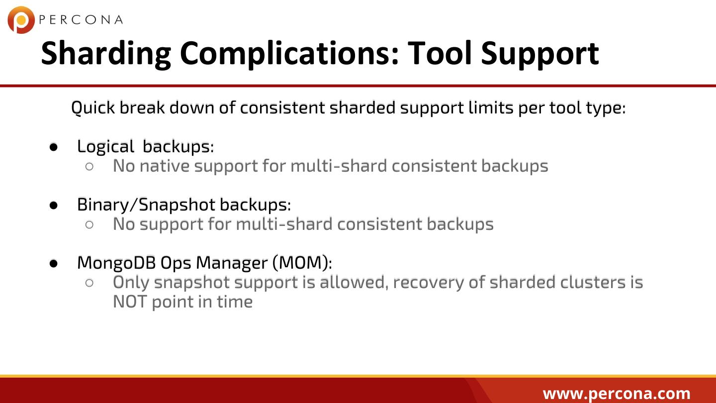 16 .Sharding Complications: Tool Support Quick break down of consistent sharded support limits per tool type: ● Logical backups: ○ No native support for multi-shard consistent backups ● Binary/Snapshot backups: ○ No support for multi-shard consistent backups ● MongoDB Ops Manager (MOM): ○ Only snapshot support is allowed, recovery of sharded clusters is NOT point in time www.percona.com