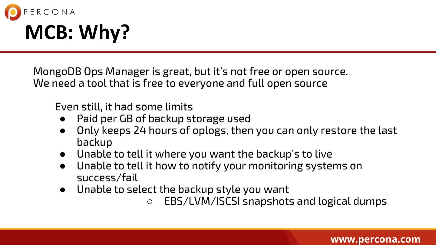 22 .MCB: Why? MongoDB Ops Manager is great, but it’s not free or open source. We need a tool that is free to everyone and full open source Even still, it had some limits ● Paid per GB of backup storage used ● Only keeps 24 hours of oplogs, then you can only restore the last backup ● Unable to tell it where you want the backup’s to live ● Unable to tell it how to notify your monitoring systems on success/fail ● Unable to select the backup style you want ○ EBS/LVM/ISCSI snapshots and logical dumps www.percona.com