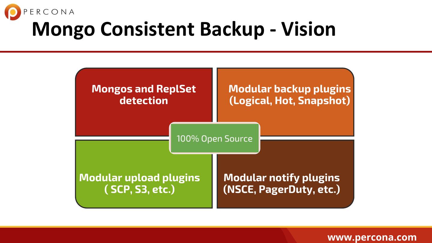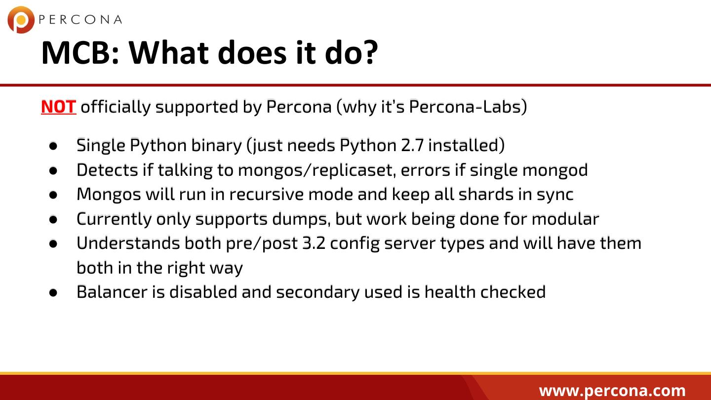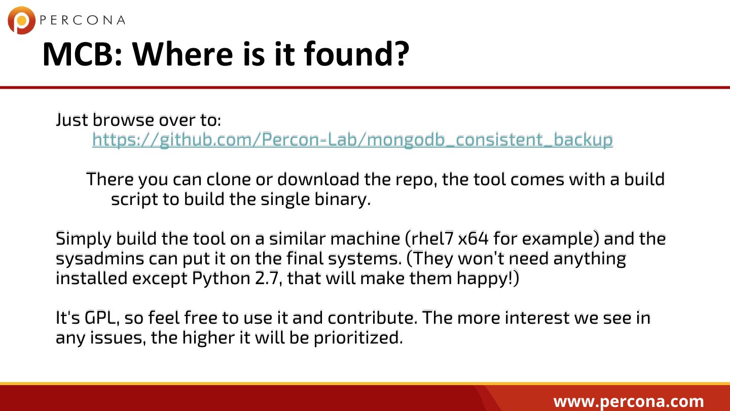 27 .MCB: Where is it found? Just browse over to: https://github.com/Percon-Lab/mongodb_consistent_backup There you can clone or download the repo, the tool comes with a build script to build the single binary. Simply build the tool on a similar machine (rhel7 x64 for example) and the sysadmins can put it on the final systems. (They won’t need anything installed except Python 2.7, that will make them happy!) It's GPL, so feel free to use it and contribute. The more interest we see in any issues, the higher it will be prioritized. www.percona.com