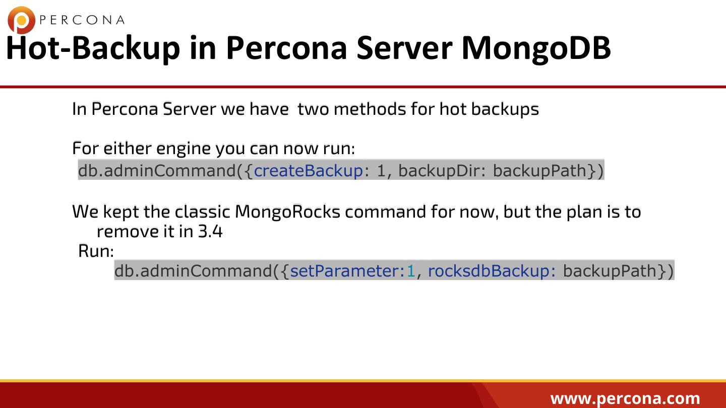 29 .Hot-Backup in Percona Server MongoDB In Percona Server we have two methods for hot backups For either engine you can now run: db.adminCommand({createBackup: 1, backupDir: backupPath}) We kept the classic MongoRocks command for now, but the plan is to remove it in 3.4 Run: db.adminCommand({setParameter:1, rocksdbBackup: backupPath}) www.percona.com