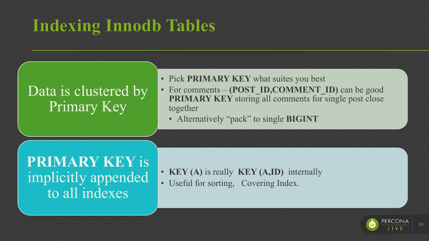 13 .Indexing Innodb Tables • Pick PRIMARY KEY what suites you best Data is clustered by • For comments – (POST_ID,COMMENT_ID) can be good PRIMARY KEY storing all comments for single post close Primary Key together • Alternatively “pack” to single BIGINT PRIMARY KEY is • KEY (A) is really KEY (A,ID) internally implicitly appended • Useful for sorting, Covering Index. to all indexes 13