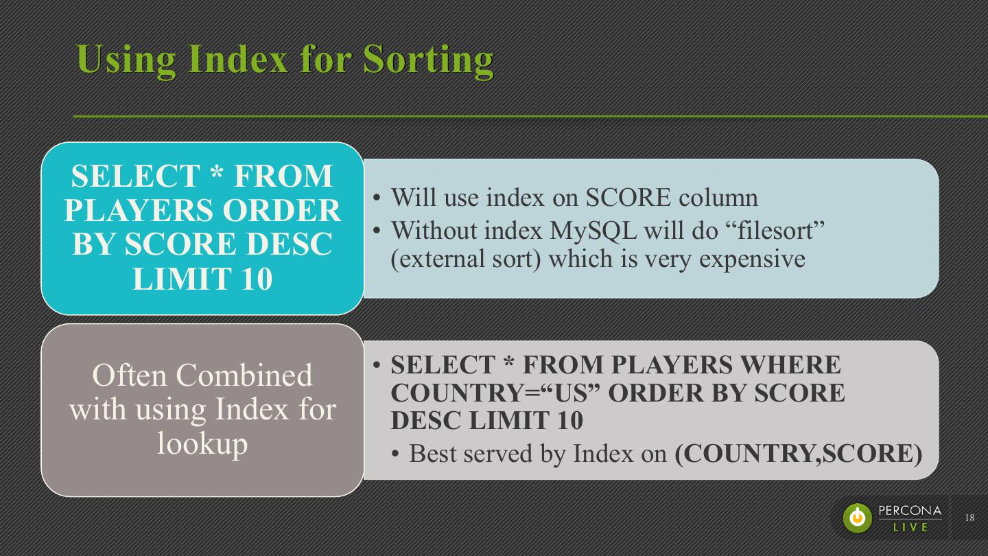 19 .Multi Column indexes for efficient sorting It becomes even more restricted! KEY(A,B) Will use Index for Sorting • ORDER BY A - sorting by leading column • A=5 ORDER BY B - EQ filtering by 1st and sorting by 2nd • ORDER BY A DESC, B DESC - Sorting by 2 columns in same order • A>5 ORDER BY A - Range on the column, sorting on the same Will NOT use Index for Sorting • ORDER BY B - Sorting by second column in the index • A>5 ORDER BY B – Range on first column, sorting by second • A IN(1,2) ORDER BY B - In-Range on first column • ORDER BY A ASC, B DESC - Sorting in the different order 19
