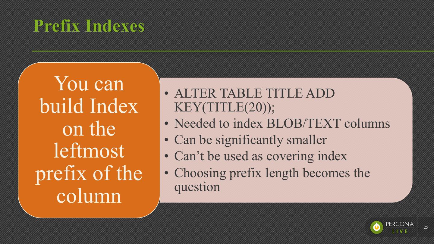 25 .Prefix Indexes You can • ALTER TABLE TITLE ADD build Index KEY(TITLE(20)); • Needed to index BLOB/TEXT columns on the • Can be significantly smaller leftmost • Can’t be used as covering index prefix of the • Choosing prefix length becomes the question column 25