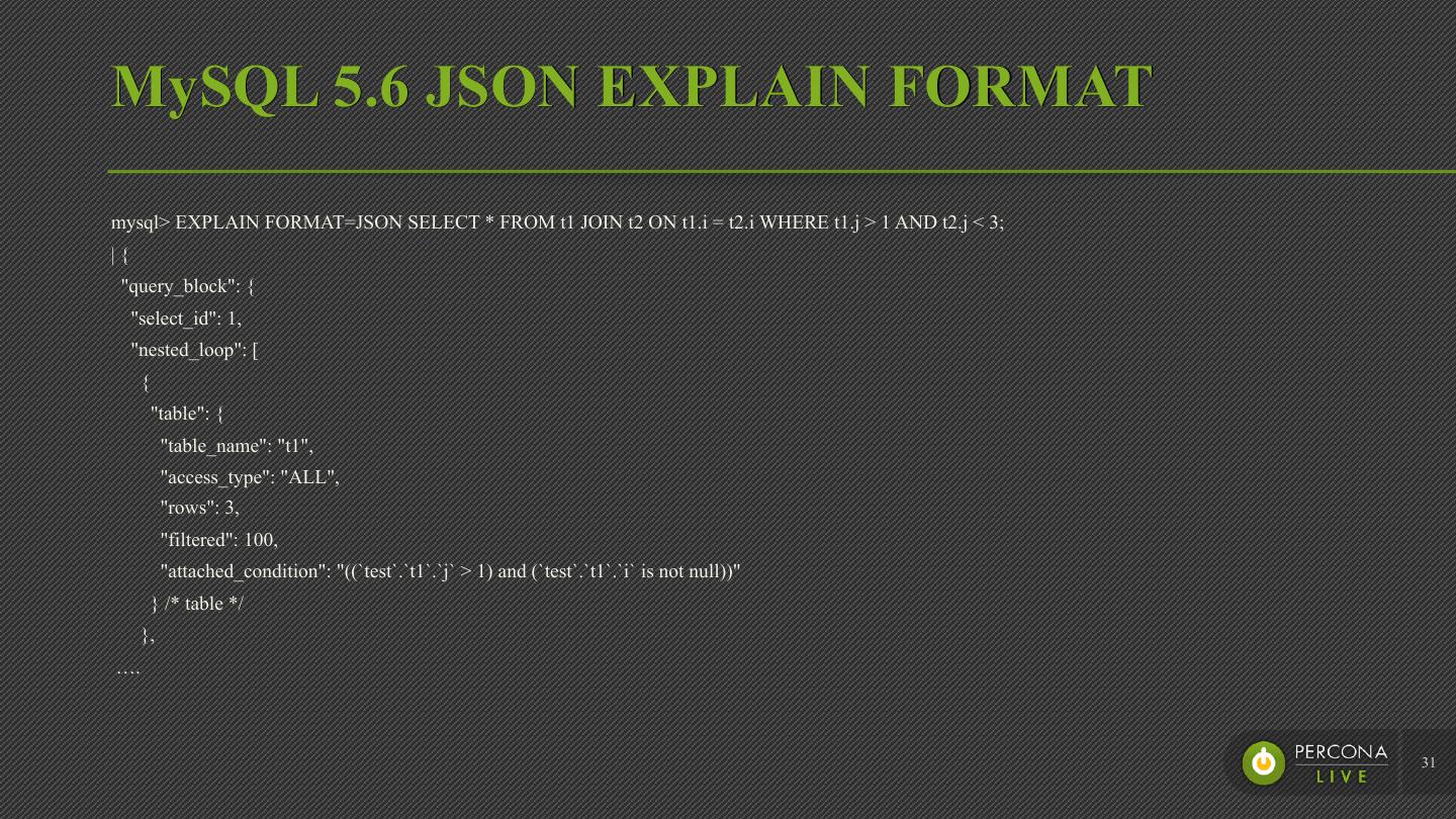 28 .ICP Examples SELECT A … WHERE B=2 AND C LIKE “%ill%’ • MySQL 5.5 and below - KEY (B) – Traditional. Using index for range only - KEY (B,C,A) - Covering. All involved columns included • MySQL 5.6 - KEY(B,C) • Range access by B; Filter clause on C only read full row if match More cases • SELECT * …WHERE A=5 and C=6 ; KEY (A,B,C) - Will scan all index entries with A=5 not all rows 28