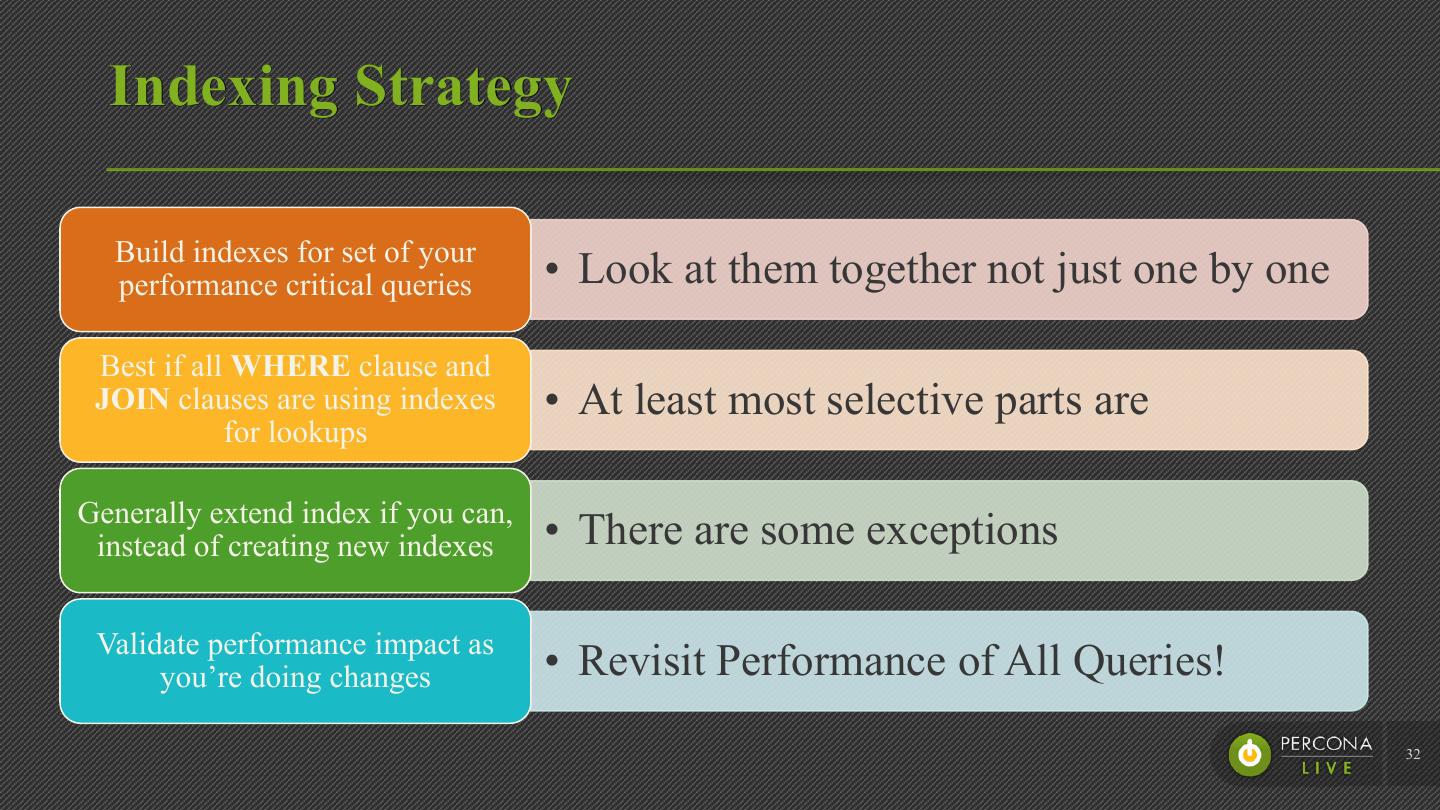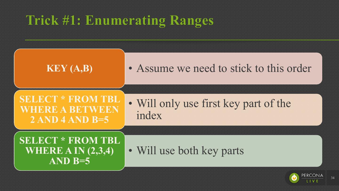 17 .The First Rule of MySQL Optimizer MySQL will stop using key parts in multi part index as soon as it met the real range (<,>, BETWEEN), it however is able to continue using key parts further to the right if IN(…) range is used 17
