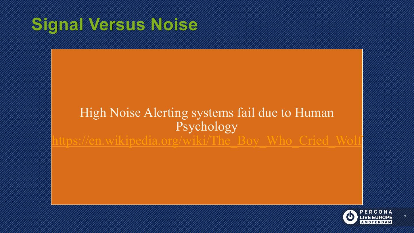 7 .Signal Versus Noise High Noise Alerting systems fail due to Human Psychology https://en.wikipedia.org/wiki/The_Boy_Who_Cried_Wolf 7
