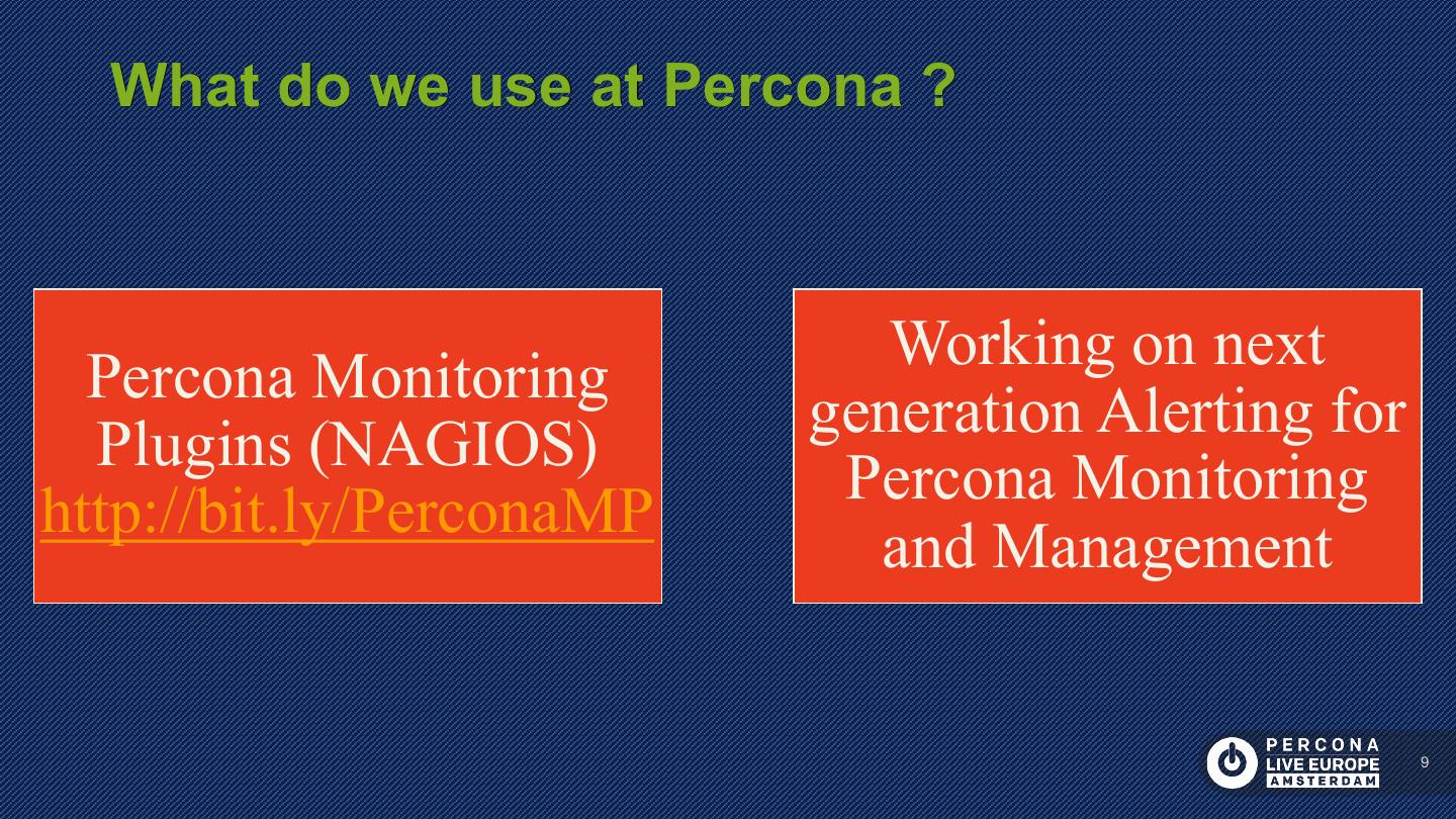 9 . What do we use at Percona ? Working on next Percona Monitoring generation Alerting for Plugins (NAGIOS) Percona Monitoring http://bit.ly/PerconaMP and Management 9
