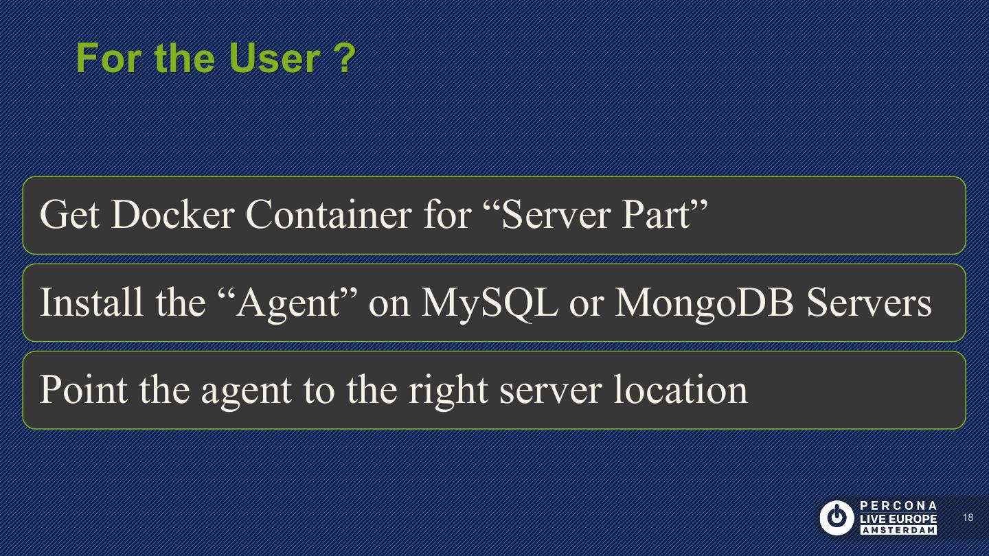 18 . For the User ? Get Docker Container for “Server Part” Install the “Agent” on MySQL or MongoDB Servers Point the agent to the right server location 18