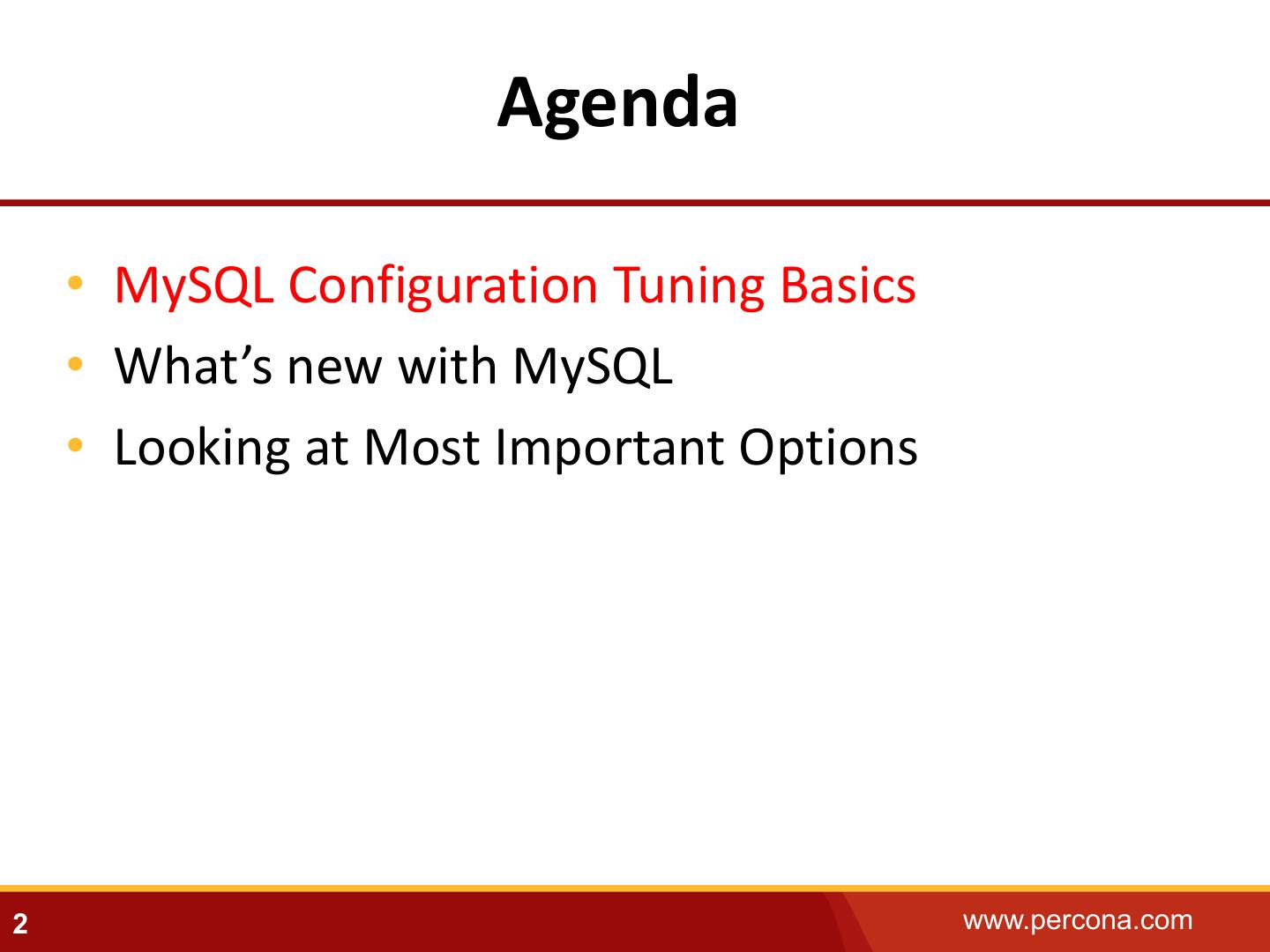 2 . Agenda • MySQL Configuration Tuning Basics • What’s new with MySQL • Looking at Most Important Options 2 www.percona.com