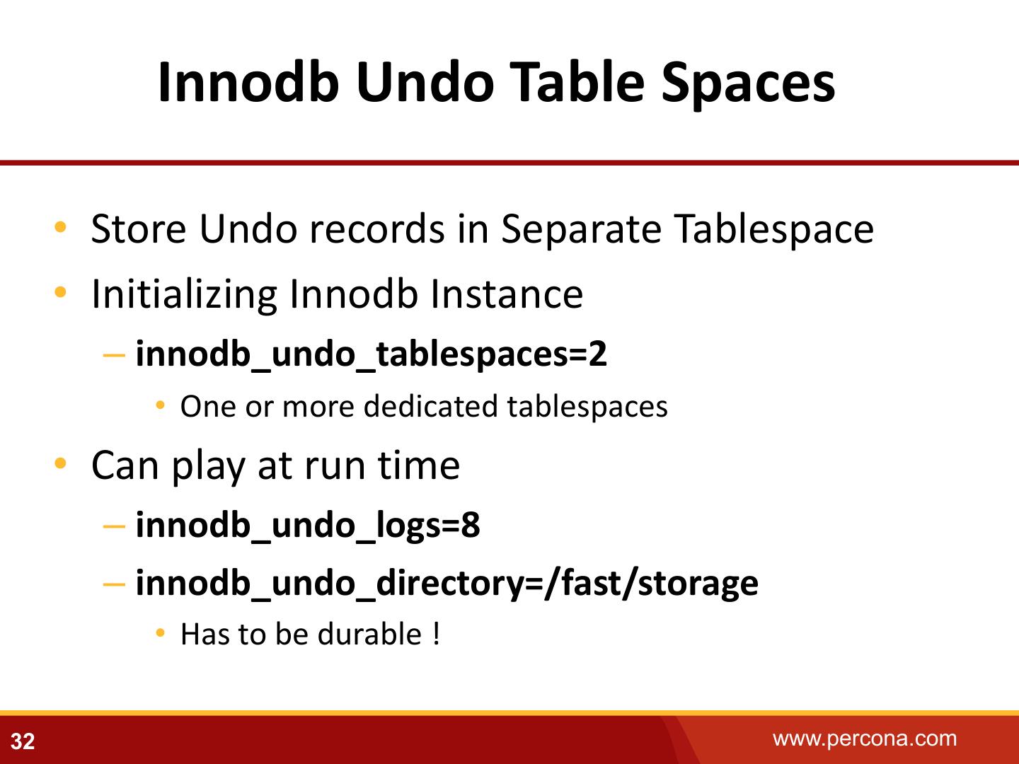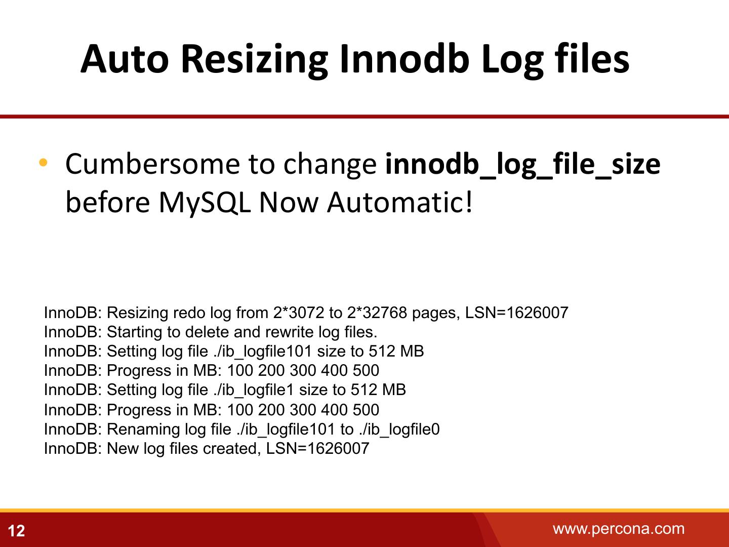 12 . Auto Resizing Innodb Log files • Cumbersome to change innodb_log_file_size before MySQL Now Automatic! InnoDB: Resizing redo log from 2*3072 to 2*32768 pages, LSN=1626007 InnoDB: Starting to delete and rewrite log files. InnoDB: Setting log file ./ib_logfile101 size to 512 MB InnoDB: Progress in MB: 100 200 300 400 500 InnoDB: Setting log file ./ib_logfile1 size to 512 MB InnoDB: Progress in MB: 100 200 300 400 500 InnoDB: Renaming log file ./ib_logfile101 to ./ib_logfile0 InnoDB: New log files created, LSN=1626007 12 www.percona.com