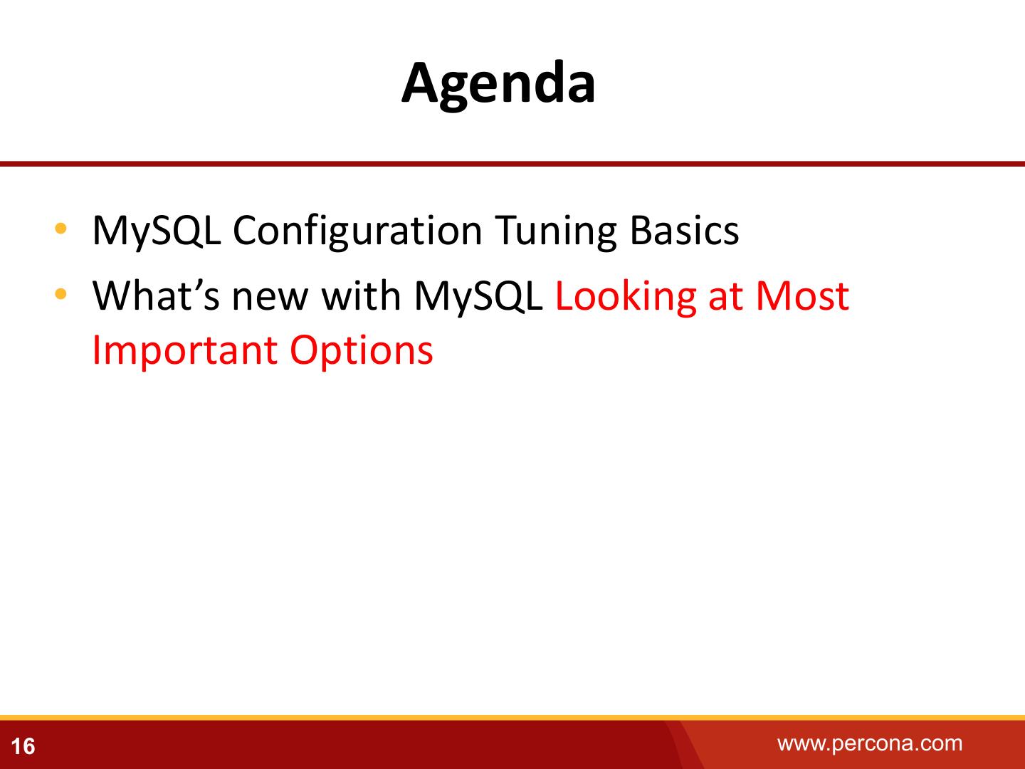 16 . Agenda • MySQL Configuration Tuning Basics • What’s new with MySQL Looking at Most Important Options 16 www.percona.com