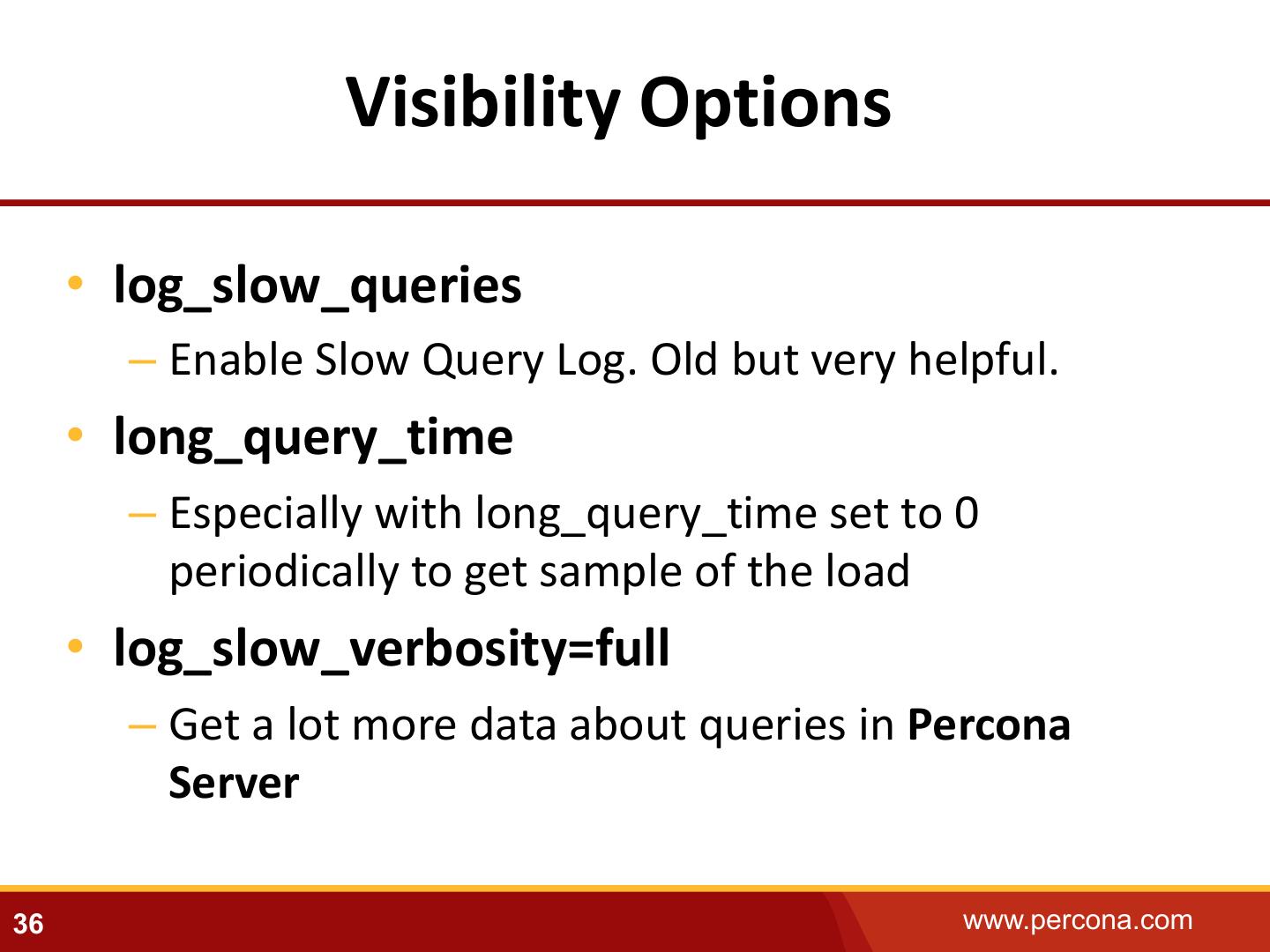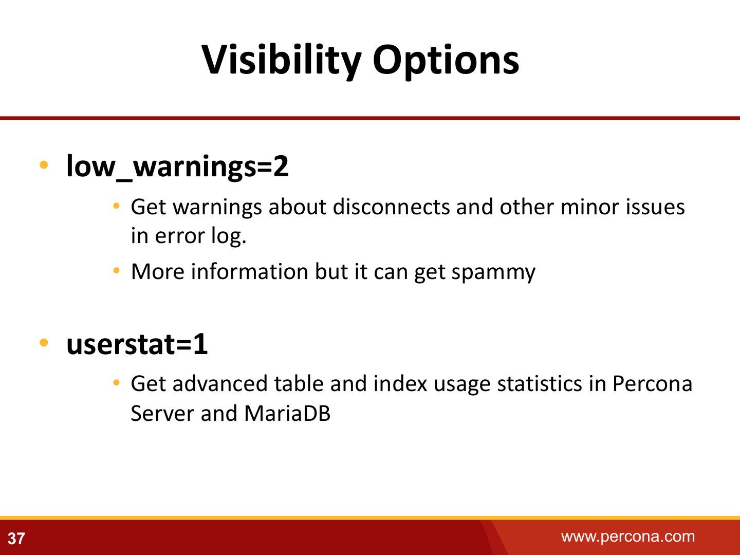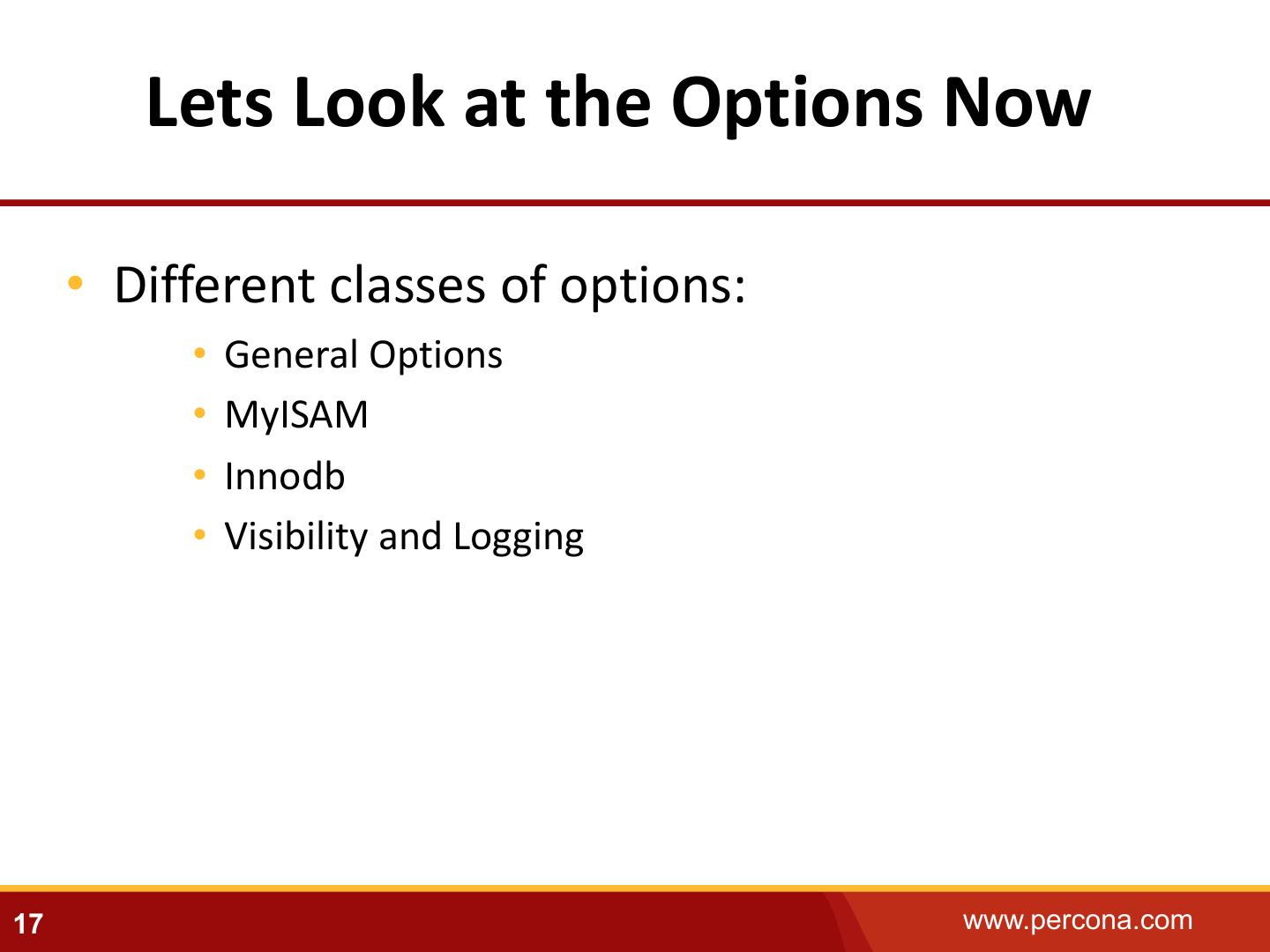 17 . Lets Look at the Options Now • Different classes of options: • General Options • MyISAM • Innodb • Visibility and Logging 17 www.percona.com