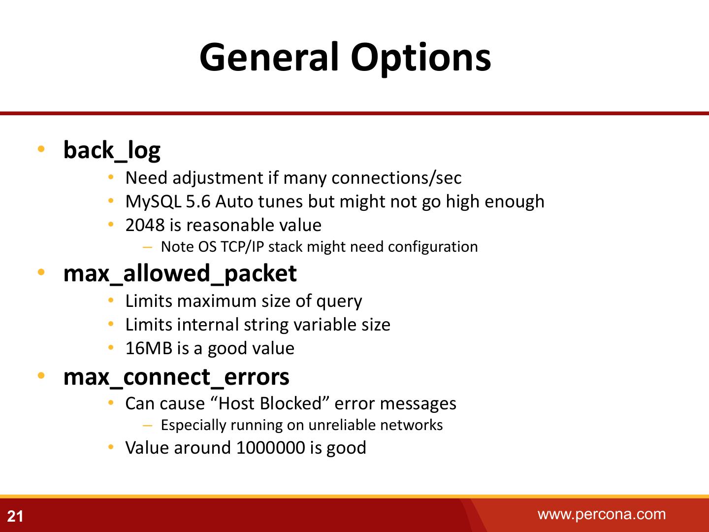 21 . General Options • back_log • Need adjustment if many connections/sec • MySQL 5.6 Auto tunes but might not go high enough • 2048 is reasonable value – Note OS TCP/IP stack might need configuration • max_allowed_packet • Limits maximum size of query • Limits internal string variable size • 16MB is a good value • max_connect_errors • Can cause “Host Blocked” error messages – Especially running on unreliable networks • Value around 1000000 is good 21 www.percona.com