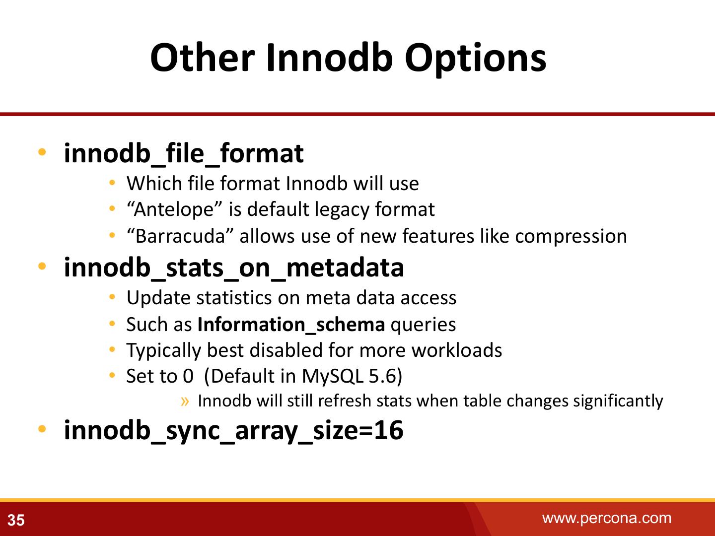 25 . General Options • sort_buffer_size • In memory buffer used for sorting • Watch sort_merge_passes • Consider setting for session for large queries • Default lowered to 256K on MySQL 5.6 – Large values hurt performance of small queries • join_buffer_size • Helps performance of Joins with no indexes – Better get rid of such Joins! • Also used with BKA in MySQL 5.6 • 8MB can be reasonable value • default_storage_engine • Use this engine for tables if not specified • Also check default-tmp-storage-engine 25 www.percona.com