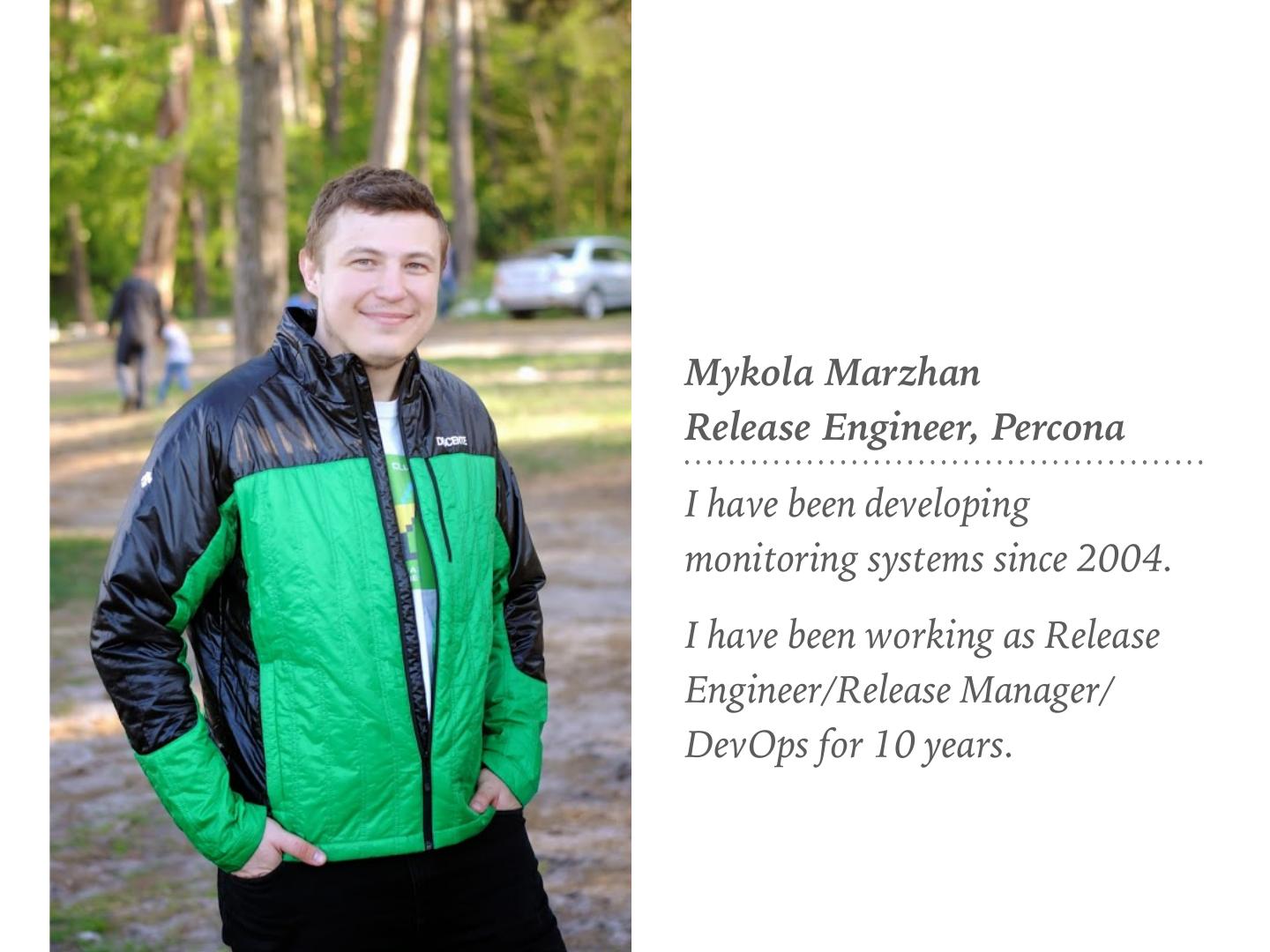 2 .Mykola Marzhan Release Engineer, Percona I have been developing monitoring systems since 2004. I have been working as Release Engineer/Release Manager/ DevOps for 10 years.