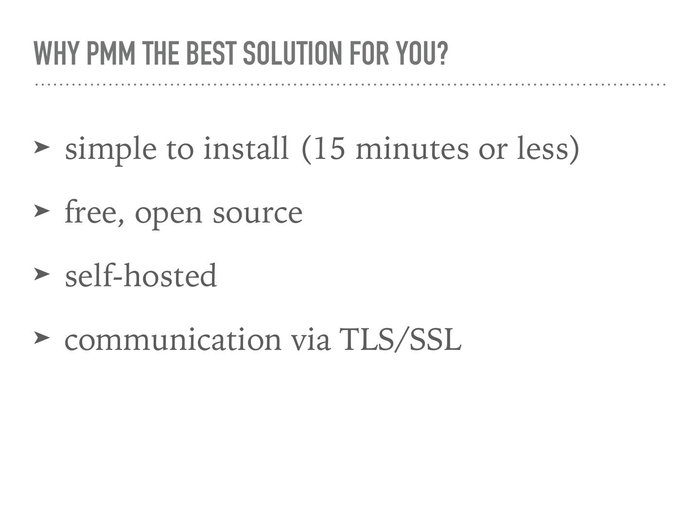 5 .WHY PMM THE BEST SOLUTION FOR YOU? ➤ simple to install (15 minutes or less) ➤ free, open source ➤ self-hosted ➤ communication via TLS/SSL